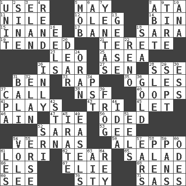 ACROSS 1. One who uses or employs something 5. Fifth month 8. "One Day ___ Time" 11. Mediterranean tributary 12. Cassini of fashion 14. Storage container 15. Silly 17. Object of repulsion 18. "Two Mules for Sister ____" 19. Looked after 21. Cylindrical with tapered ends 23. Lion 25. Toward the sea 26. Astrian river, tributary to the Danube 27. Elected rep. 28. Compass dir. 31. Benjamin's nick name 33. Hit sharply and swiftly 35. Stares at amorously 37. Give a ring to 38. Science/research agcy. 40. I made a mistake 41. Live dramatic performances 43. Three (prefix) 45. Allow 46. The 18th letter of the Arabic alphabet 47. Make a knot 50. Wrote a lyric poem 52. "Two Mules for Sister ____" 53. Turn to the right 54. Actresses Bloom and Felton 56. City in Syria 61. Australian parrot (variant) 62. Pull into pieces 65. First course 66. Raised railways 67. Writer Wiesel 68. French philosopher Descartes 69. Observe 70. Filthy place 71. Backtalk DOWN 1. A single undivided whole 2. Trig term 3. Style 4. Tear apart 5. Disorderly crowd 6. In the manner of 7. Gossips 8. Blind as ____ 9. Hoop that covers a wheel 10. Santa ___, CA 13. Honkers 16. Snakelike fish 18. Ocean 20. Letter starter 22. Former U.S. Attorney General Janet 24. Northwest Algerian city 26. Inwardly 28. A type of plum 29. Back-to-school mo. 30. Double-curved letter 31. Indonesian resort city 32. Enthusiasm 34. Pacific Standard Time (abbr.) 36. Aureate 37. Numbers guy (abbr.) 39. Toadlike animal 42. Comedian Laurel of Laurel & Hardy 44. The content of cognition 48. Feeling or showing extreme anger 49. Artist's stands 51. Snakelike fish 52. _ Lanka 54. Grand slam 55. Celtic language 57. Hearing organs 58. Entreaty 59. Baking dishes 60. Lyric poems 61. French article 63. Small island 64. Marina Del _, California