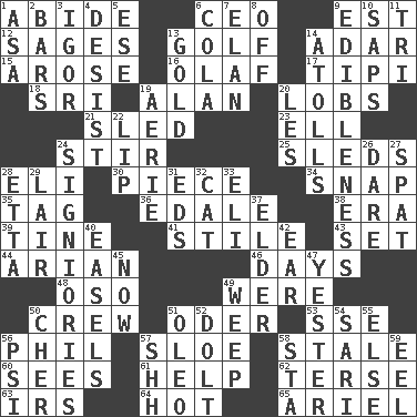 ACROSS 1. Tolerate 6. Corporate head (abbr.) 9. Eastern Standard Time (abbr.) 12. Gurus 13. Eighteen holes 14. The sixth month of the Jewish calendar 15. Came up 16. Norwegian king 17. Native american tent (variation) 18. _ Lanka 19. Actor Alda or Thicke 20. Tennis shots 21. Downhill vehicle 23. Pipe bend 24. Use a swizzle stick 25. Bobsleighs 28. Biblical high priest 30. Component 34. Fastener 35. Label 36. Peak District village in England 38. Epoch 39. Prong on a fork 41. Vertical member of a panel or frame 43. Arrange properly for use 44. Believer in; advocate of (suffix) 46. 24-hour periods 48. Bear (Spanish) 49. Past tense of be (plural) 50. Group working together 51. River in Europe 53. Compass dir. 56. Silvers or Donahue 57. _ gin 58. Lacking originality or spontaneity 60. Perceives with the eye 61. Aid 62. Laconic 63. Big collection agency 64. Being at a high temperature 65. Satellite of Uranus DOWN 1. White ___ sheet 2. Taverns 3. Composer Stravinsky 4. Stop 5. Compass dir. 6. Root beer relative 7. Style 8. No longer planned or scheduled 9. The property of being fit to eat 10. Plant excrements 11. Three (prefix) 13. Precious metal 14. Ringlike coral islands and reefs 19. Nest on high 20. French article 22. Mouth edge 24. Seigniories (variant) 26. Have the gumption 27. Petty quarrel 28. Singer James 29. Den 31. Begley and Asner 32. Feline 33. Biblical high priest 37. A person who is older than you are 40. Artist's stands 42. Hearing organ 45. At this time 47. Last past 49. Shed a tear 50. "Mermaids" star 51. Butter sub 52. Stupid person 54. Indian skirt 55. Otherwise 56. 23rd letter of the Greek alphabet 57. Quiet! 58. R.R. building 59. Snakelike fish