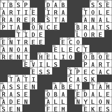 ACROSS 1. Cook's measure (abbr.) 5. Apply (a substance) by light strokes 8. Compass dir. 11. Nick name for Arthur 13. Retirement account (abbr.) 14. Lacquered or enameled metalware 15. More uncommon 16. R.R. building 17. Of or related to the anus 18. Parent Teacher Assoc. 19. Single time 21. Naughty children 22. Periodic rise and fall of the sea level 24. Old wives' tales, e.g. 25. Main course 27. Environmental prefix 29. Small Philippine buffalo 30. Choose 32. Monthly bill 33. Sun: prefix 35. Mitch Miller's instrument 39. Vices 41. Component 42. Curvy letter 43. Medicinal drug used to evoke vomiting 45. Jacques of French films 48. Keg 49. NE Netherlands city 50. Collude with 52. Scottish cap 55. To erase 56. Chief or king in Benin or Nigeria 57. Peak District village in England 59. Arabian gulf 60. Everything 61. Thermoplastic polyamide 62. Elected rep. 63. Opposite of masc. 64. Makes supply last DOWN 1. Canvas cover 2. Naughty child 3. Ski resort town in Vermont 4. Sliced dessert 5. Flat circle 6. Johnson of "Laugh-In" 7. Sound made by sheep 8. Underwater navigation system 9. Chalkboard 10. Snakelike fish 12. Wear away 14. Edible starchy tuberous root 20. Born 21. Coalition 23. Feeling or showing extreme anger 25. Ewer handle 26. Compass dir. 27. Connecticut Ivy Leaguer 28. Corporate head (abbr.) 30. Raised railways 31. Drinks excessively 33. Part of HMS, perhaps 34. Raised railways 36. Sass 37. Mouth or opening 38. And so on (abbr.) 40. Distinctive style or manner 43. Frozen water 44. Eucharist need 45. Sadhe (variant) 46. NE Netherlands city 47. Adolescent 49. Caspian sea tributary 50. Competent 51. Lip ointment 53. Medicinal plant 54. Not women's 56. Clumsy lout 58. Color