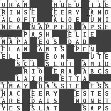 ACROSS 1. NW Algerian seaport 5. Took on color 9. Neckwear 12. Wash lightly 14. Suggestive of the supernatural 15. Added to 16. Upward 17. _ vera 18. Single; one (prefix) 19. Teachers' org. 20. Slept 23. Domed church section 24. Romantic infatuation 25. Writer Wiesel 27. California wine valley 30. Greek goddess of the dawn 32. June honoree 33. Flair 34. Pismires 36. Animal enclosure 38. Pipe bend 39. Period of immesurable duration 40. Shoshoni 43. _-fi 46. Groove 48. Among 49. River (Sp.) 51. Epoch 52. Lettered men learn these first 53. Den 54. Singer James 56. "If ____ say so..." 58. Hyrax 61. Curvy letter 64. Big _ 65. Suggestive of the supernatural 66. _____ Park, CO 68. "We ___ not amused" (Victoria) 69. Raised platform 70. Music written for nine 71. Consenting reply 72. Narrow board 73. Plant excrements DOWN 1. Northwest Algerian city 2. Cause heat under the collar 3. Small Philippine buffalo 4. Science/research agcy. 5. Pile 6. Ubangi River tributary 7. Worn away 8. Color 9. Grayish beige 10. Taverns 11. Singer Brickell 13. Inactive volcano in Sicily 21. Toward the sea 22. Gives a jingle 23. Assistant 24. Baking dish 26. Infant locale 27. Born 28. Everything 29. Friends 31. Fur scarf 35. Sounds asleep 37. Unfeeling 41. Nervous spasm 42. Begley and Asner 44. Supercomputer manufacturer 45. One more than two 47. Jacques of French films 48. Auto club (abbr.) 50. Severe or trying experience 53. Shoestrings 55. Adolescent 56. "If ____ say so..." 57. Female horse 59. Roberta Peters solo 60. System (abbr.) 61. Inactive volcano in Sicily 62. Ooze 63. Fast planes 65. Begley and Asner 67. Mayday