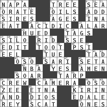 ACROSS 1. California wine valley 5. Family _ (genealogy) 9. Ocean 12. Declaim 14. Petroleums 15. Say or write further 16. Fathers 17. Ripens 18. _ tizzy (2 wds.) 19. Ingest 20. Being or containing an acid 23. Having or resembling wings 24. Took on color 25. Labels 27. Grain storage tower 30. To free from 32. Compass dir. 33. Prepare for publication 34. A blast of a horn 36. Air pressure measure (abbr.) 38. Snakelike fish 39. Third day of the wk. 40. Small boy 43. Bear (Spanish) 46. Indian skirt 48. Stalk of a moss capsule 49. Basketball assoc. 51. Consenting reply 52. So be it 53. Fly high 54. Canvas cover 56. Group working together 58. Device for capturing images 61. Bear (Spanish) 64. Last letter of the English alphabet 65. Inactive volcano in Sicily 66. Japanese brewing company 68. Also 69. "Vaya con ____" 70. Peak District village in England 71. Marina Del _, California 72. Get outta here! 73. Washington bills DOWN 1. Sense of smell 2. Operatic vocal solo 3. Component 4. Had dinner 5. Frog relative 6. Swiss mountan, "Queen of the Mountains" 7. Chooses 8. Curvy letter 9. Travel by water 10. Pulitzer Prize-winning author Ferber 11. The sixth month of the Jewish calendar 13. Son of Isaac 21. Foregone conclusion 22. Foolish or stupid persons 23. Eons 24. Being at a high temperature 26. Cleo's killer 27. Observe 28. Binary compound 29. _ and Stitch 31. A city in N France, SE of Calais 35. Cigar-shaped 37. A whole individual unit 41. Had dinner 42. One of the 12 tribes of Israel 44. Frozen precipitation 45. Chief or king in Benin or Nigeria 47. Astrian river, tributary to the Danube 48. Plant excrement 50. Northern region 53. Sleazy 55. Libertine 56. Russian ruler of old 57. French philosopher Descartes 59. Small Philippine buffalo 60. Vertical spar for supporting sails 61. Northwest Algerian city 62. Filth; sediment 63. Washington bills 65. Begley and Asner 67. Wedding promise