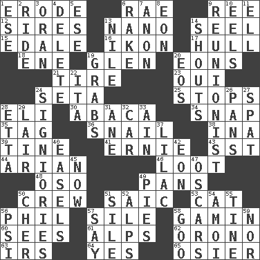 ACROSS 1. Wear away 6. Actress Charlotte 9. To riddle 12. Begets 13. Billionth: prefix 14. Stitch closed the eyes of (a falcon) 15. Peak District village in England 16. Image 17. Frame or body of a ship 18. Compass dir. 19. Small, secluded valley 20. Immeasurably long periods of time 21. Hoop that covers a wheel 23. Fr. "Yes" 24. Bristle 25. Obstructs or blocks passage 28. Connecticut Ivy Leaguer 30. Phillipine bananalike plant 34. Fastener 35. Label 36. Slow-paced one 38. _ tizzy (2 wds.) 39. Prong on a fork 41. Bert's buddy 43. Fast jet (abbr.) 44. Believer in; advocate of (suffix) 46. Spoils 48. Bear (Spanish) 49. Baking dishes 50. Group working together 51. Ketch in the Levant 53. Domesticated feline 56. Silvers or Donahue 57. Drop; flow; fall 58. Homeless child 60. Observes 61. High mountains 62. U. of Maine site 63. Big collection agency 64. Consenting reply 65. Flexible twig of a willow tree DOWN 1. Compass dir. 2. Travel on an animal 3. NW Algerian seaport 4. Keyboard key 5. Compass dir. 6. Immoral or dissolute person 7. At once, immediately (arch.) 8. Age 9. One who advocates reunion 10. Snakelike fish 11. Pipe bend 13. Mediterranean tributary 14. Yells 19. Takes hold of 20. Greek goddess of the dawn 22. Call ___ day 24. Seigniories (variant) 26. Baking dishes 27. Argument over a trivial matter 28. Singer James 29. Den 31. One (Scot) 32. Auto 33. The 18th letter of the Arabic alphabet 37. Pale purple color 40. Artist's stands 42. Age 45. Immediately 47. Motion picture awards 49. Sliced desserts 50. "Mermaids" star 51. Drop; flow; fall 52. High mountains 54. Mine, in Marseilles 55. Prong on a fork 56. Air pressure measure (abbr.) 57. Declare 58. Thick or sticky substance 59. And not