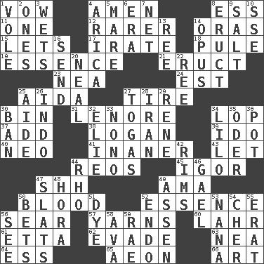 ACROSS 1. Solemn pledge 4. So be it 8. Curvy letter 11. Single 12. More valued for its uncommonness 14. Mouths or openings 15. Allows 17. Feeling or showing extreme anger 18. Whine 19. Substance 21. Spew [out] 23. Teachers' org. 24. Eastern Standard Time (abbr.) 25. Opera by Verdi 27. Hoop that covers a wheel 30. Storage container 31. Poe poem 34. Chop off 37. Find the sum of 38. Utah city north of Ogden 39. Wedding promise 40. Modern: prefix 41. More lacking in sense or substance 43. Allow 44. Vintage cars 45. Composer Stravinsky 47. Quiet! 49. Housemaid (var.) 50. Vital fluid 52. Core 56. Dry up 57. Entertaining tales 60. Cowardly lion portrayer 61. Singer James 62. Elude 63. Teachers' org. 64. Double-curved letter 65. Age 66. Nonscientific branch of learning DOWN 1. Short-tailed, large-bodied rat 2. Washington bills 3. Moistens 4. N. Chile seaport 5. Female horse 6. Period 7. Fish or hair follower 8. Spew [out] 9. Table seasoning 10. Compass dir. 13. To separate or throw off 14. Musical composition 16. Post 20. Be tempered by heat 22. To sift 25. Assistant 26. _ china 27. Ancient Roman robes 28. SW Asia republic 29. French philosopher Descartes 30. Prohibit 32. Writer Wiesel 33. Words to Nanette 34. _ and Stitch 35. Baltic tributary 36. Plant holder 42. Basketball hoops 44. 17th letter of the Greek alphabet 46. Highlander 47. Narrow boards 48. Israeli folk dance 49. NE Netherlands city 50. Antes 51. Color 52. Inside; within (prefix) 53. Nanny 54. "Mermaids" star 55. Part of Q.E.F. 56. Observe 58. Actress Gardner 59. Actress Charlotte