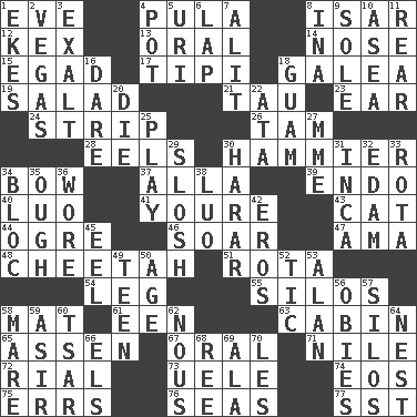 ACROSS 1. First lady 4. Monetary unit of Botswana 8. Astrian river, tributary to the Danube 12. A weed 13. Relating to the mouth 14. Sense of smell 15. Mild oath 17. Native american tent (variation) 18. An organ shaped like a helmet 19. Vegetable dish 21. The 19th letter of the Greek alphabet 23. Hearing organ 24. Empty completely 26. Scottish cap 28. Snakelike fish 30. More overdramatic by comparison 34. Arrow shooter 37. Silent film actress Nazimova 39. Inside; within (prefix) 40. Nilotic language 41. You are 43. Domesticated feline 44. Legendary monster 46. Fly high 47. Housemaid (var.) 48. Leopard's kin 51. Roll call or roster of names 54. Part of a journey 55. Grain storage towers 58. Floor protector 61. Car or cant ending 63. Small house or cottage 65. NE Netherlands city 67. Taken by mouth 71. Mediterranean tributary 72. Monetary unit of Yemen 73. Ubangi River tributary 74. Greek goddess of the dawn 75. Blunders 76. Oceans 77. Fast jet (abbr.) DOWN 1. Makes supply last 2. Viva Las _ 3. Honor 4. Cooking vessel 5. RI univ. 6. Infant locale 7. Came down and settled, as after flight 8. _ tizzy (2 wds.) 9. Flatfish 10. Toward the sea 11. Bring up, as a child 16. Have the gumption 18. Island territory of the United States 20. Pass on 22. _ moment's notice (2 wds.) 25. Shaw product 27. Madame (abbr.) 29. Splash clumsily 30. Ethiopian city, capital of Harari 31. South American Indian 32. Dutch treat 33. Round or rotation of duties 34. Coalition 35. Ending for "Through" and "Enough" 36. Had on 38. Nilotic language 42. Greek god of love 45. Snakelike fish 49. Adolescent 50. Mature 52. Nervous spasm 53. Actor Alda or Thicke 56. Off-Broadway awards 57. Grain storage towers 58. Female horse 59. SW Saudi Arabia district 60. Russian ruler of old 62. Common sense 64. Egg locale 66. Raised railways 68. To separate or throw off 69. According to 70. French article