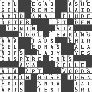 ACROSS 1. Australian flightless bird 4. Mild oath 8. American tennis player Robert 12. Commissioned military rank (abbr.) 13. Painter Guido (1575-1642) 14. Put down 15. Among 17. Of or related to the anus 18. Evade 19. Prevent from occurring 21. Allow 23. Lair 24. Soviet premier 1918-24 26. R.R. building 28. Implement 30. Rending 34. Actress Gardner 37. Bits 39. Arab leader 40. Set 41. Ferber et al. 43. Chicken ___ king 44. Cuts off 46. Kenny Rogers chart-topper in '80 47. It is so 48. Motivate 51. Extremities 54. Actress Gardner 55. Cell (Danish) 58. According to 61. Fitting 63. Forest 65. Unit of acoustic absorption 67. Stockings 71. Ancient Roman robe 72. Arab leader 73. Small Philippine buffalo 74. Make lace 75. Tenement units (abbr.) 76. Trial 77. _ Lanka DOWN 1. Mild oath 2. Klaipeda city 3. Join together 4. Epoch 5. Commissioned mil. rank 6. Santa ___, CA 7. Deli pickle 8. 100% 9. Saudi Arabian king (1953-1964) 10. Flintstone garb 11. Paradise 16. Incision 18. Singer James 20. _ de Janeiro 22. Compass dir. 25. Brief written record 27. "We ___ not amused" (Victoria) 29. Dipping utensil 30. Sadhe (variant) 31. "If ____ say so..." 32. "Death on the ____" 33. Pate de foie ____ 34. Hindu god of fire 35. Distinctive style or manner 36. High mountains 38. Heredity factor (abbr.) 42. Synchronize (abbr.) 45. Health resort 49. _ the terrible 50. Hit sharply and swiftly 52. Morning condensation 53. Slit 56. Plunders 57. _ Allan Poe 58. At sea 59. Desk light 60. "This won't hurt ____!" 62. Not this but _ 64. Suttee (variant) 66. Big collection agency 68. Single 69. Mayday 70. Consume