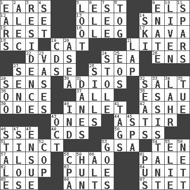 ACROSS 1. Hearing organs 5. For fear that 9. Raised railways 12. Toward shelter 13. Butter sub 14. Sever or remove by pinching or nipping 15. Relief 16. Cassini of fashion 17. Polynesian shrub of the pepper family 18. _-fi 19. Feline 21. 61 cubic inches 22. Movie discs 24. Ocean 26. Followers of ems 27. Gospel singer Marvin 28. Constrict 29. Elected reps. 30. Goodbye (Sp.) 32. Table seasoning 36. Single time 37. 100% 38. He sold his birthright 39. Lyric poems 40. An arm off of a larger body of water 42. American tennis player Robert 43. Washington bills 44. Moving about 46. Compass dir. 49. Music discs 50. Global Positioning Systems (abbr.) 51. Colored lightly or faintly 53. Girls' org. (abbr.) 54. Nine, plus one 57. In addition 58. US Secretary of Labor Elaine L. _ 61. Diluted with white 62. Central Nebraska county 63. Whine 64. A single undivided whole 65. Compass dir. 66. Pismires 67. Proofreading order DOWN 1. Hearing organs 2. Actor Baldwin 3. Home 4. Put into a specified state 5. Spoils 6. Pipe bend 7. Perceive with the eye 8. Coat; cloak 9. Related on the mother's side 10. Make or become more lively 11. Practice fights 14. What Jean-Claude Killy likes to do 19. Music discs 20. Toward the sea 21. Pet locale 23. Flower holders 24. Took without asking 25. Greek goddess of the dawn 27. Post 28. Beverly of Met fame 29. "Barney Miller" actor Jack 31. Natives or inhabitants of Denmark 32. Theater features 33. Helper 34. Cowardly lion portrayer 35. Third day of the wk. 40. Indiana (abbr.) 41. Labels 43. Sep. follower 45. Health resort 46. Lacking originality or spontaneity 47. Grain storage towers 48. Follow as a consequence or result 52. Police officer (slang) 53. Moves 55. Writer Wiesel 56. Remaining after all deductions 58. Numbers guy (abbr.) 59. Attila the _ 60. Keyboard modifier key 61. Suppuration