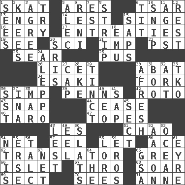 ACROSS 1. Three-handed card game 5. Ancient Greek god of war 9. Russian ruler of old 13. Engineer (abbr.) 14. For fear that 15. Scorch 16. Suggestive of the supernatural 17. Pleas 19. Perceive with the eye 20. _-fi 21. Naughty child 22. Pacific Standard Time (abbr.) 23. Dry up 25. Fluid product of inflammation 26. It is permitted: Lat. 30. Blind as ____ 34. 1973 Nobel Price Winner (Physics) Leo 35. Tined utensil 36. Simple or foolish person 39. Actor Sean's family 42. Printing process, for short 43. Fastener 44. Stop 46. Edible starchy tuberous root 47. Drinks excessively 48. French article 51. US Secretary of Labor Elaine L. _ 54. Fish or hair follower 57. Snakelike fish 58. Allow 60. Adept person 62. Interpreter 65. Jennifer or Joel 66. Small island 67. Through, poetically 68. Fly high 69. Religious group 70. Observes 71. Singer Murray DOWN 1. Perceives with the eye 2. Leg joints 3. Match 4. Attempt to accomplish something 5. Actor Baldwin 6. Painter Guido (1575-1642) 7. Eastern Standard Time (abbr.) 8. Long narrow piece of something 9. Teat (slang) 10. Sever or remove by pinching or nipping 11. Grows older 12. Respite 15. Plant excrements 18. Australian flightless bird 20. Indian titles of respect 24. City in Syria 27. Head covering 28. Supplement with great effort 29. Colored lightly or faintly 30. Anew 31. Oct. 31 cry 32. Tate display 33. Ring climax 36. Fast jet (abbr.) 37. _ tizzy (2 wds.) 38. Impair 40. Modern: prefix 41. Plant excrement 45. Religious group 48. For fear that 49. Snakelike fish 50. Narrow boards 52. Composer Copland 53. Sea 54. Nuclear Threat Initiatives 55. Celtic language 56. Baby powder 58. Old wives' tales, e.g. 59. Greek god of love 61. Jane of fiction 63. Fish or hair follower 64. Definite Article 65. Girls' org. (abbr.)