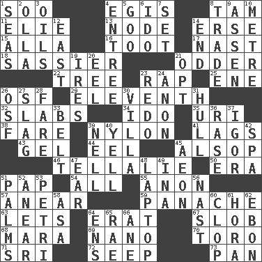 ACROSS 1. "Barney Miller" actor Jack 4. Armor plate that protects the chest 8. Scottish cap 11. Writer Wiesel 13. Thickened enlargement 14. Celtic language 15. Silent film actress Nazimova 16. A blast of a horn 17. Political cartoonist Thomas 18. More lively and spirited 21. More peculiar 22. Family _ (genealogy) 23. Hit sharply and swiftly 25. Compass dir. 26. Order of Saint Francis (abbr.) 29. Veterans Day date 32. Thick slices 34. Wedding promise 35. RI univ. 38. Conductor's collection 39. Thermoplastic polyamide 41. Straggles 43. Set 44. Snakelike fish 45. Columnist Joseph or Stewart 46. Copy Pinocchio 50. Period 51. Infant food 54. Everything 55. At once, immediately (arch.) 57. Approach 59. Flamboyance 63. Allows 64. Part of Q.E.F. 67. Messy guy 68. Hindu Mythology: god of death 69. Billionth: prefix 70. "Corrida" creature 71. _ Lanka 72. Ooze 73. Baking dish DOWN 1. Oceans 2. Rounded earthenware pot or jar 3. Lubricates 4. Main course 5. Thick or sticky substance 6. Wedding promise 7. Put into a specified state 8. Exchange 9. NE Netherlands city 10. Distance measurement (Brit.) 12. 90 degrees 14. Conclusion 19. Angers 20. Snakelike fish 21. Elect 23. Do over again 24. Soon (poet.) 26. Order of Saint Francis (abbr.) 27. Volcanic refuse 28. Conductor's collection 30. Country residence 31. Frame or body of a ship 33. Waist strap 36. To erase 37. Composer Stravinsky 39. 1994 drama film starring Jodie Foster 40. Shout 42. Health resort 45. Period of immesurable duration 47. Ewer handle 48. Portable computer 49. _ tizzy (2 wds.) 51. Insides of hands 52. Approach 53. _ dish (used to culture cells) 56. Political cartoonist Thomas 58. White ___ sheet 60. Hoof sound 61. Israeli folk dance 62. Inky black, to poets 64. Followers of ems 65. Actress Charlotte 66. One (Scot)