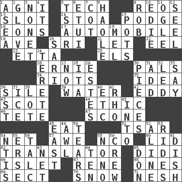 ACROSS 1. Hindu god of fire 5. Georgia ____ (Atlanta school) 9. Vintage cars 13. Narrow, elongated depression 14. Portico 15. Plash 16. Immeasurably long periods of time 17. Form of transportation 19. "___ Maria" 20. Indian title of respect (Mr.) 21. Allow 22. Snakelike fish 23. Singer James 25. Raised railways 26. Bert's buddy 30. Friends 34. Disturbances 35. It may be bright or harebrained 36. Drop; flow; fall 39. Wetness 42. Whirlpool 43. Native of Scotland 44. Principle of right and wrong 46. False hair 47. Biscuitlike quick bread 48. Consume 51. Russian ruler of old 54. Fish or hair follower 57. Deep reverence 58. Non-commissioned officer (abbr.) 60. Hat (slang) 62. Interpreter 65. "You Light Up My Life" star Conn 66. Small island 67. French philosopher Descartes 68. Washington bills 69. Religious group 70. Frozen precipitation 71. Delicate DOWN 1. At sea 2. Michael Jackson trademark 3. Music written for nine 4. It is 5. Russian ruler of old 6. Needle case 7. Small bed 8. White Person, in Hawaii 9. Director Reiner 10. Singer Brickell 11. Stare at amorously 12. Sew up the eyelids of hawks and falcons 15. Cooking vessels 18. Cartoonist voice _ Blanc 20. Indian skirt 24. Cigar-shaped 27. At this time 28. Call ___ day 29. _____ Park, CO 30. Components 31. Increase 32. Directed 33. Declare 36. Fast jet (abbr.) 37. Frozen water 38. Car dealer's back yard 40. And so on (abbr.) 41. 17th letter of the Greek alphabet 45. To the inside or interior of 48. 90 degrees 49. Leather borer 50. Separates forcefully 52. Place in a line 53. Amusement-park features 54. Nuclear Threat Initiatives 55. Celtic language 56. Baby powder 58. Words to Nanette 59. Ship's personnel 61. Food container 63. Fish or hair follower 64. Nine, plus one 65. Spanish title