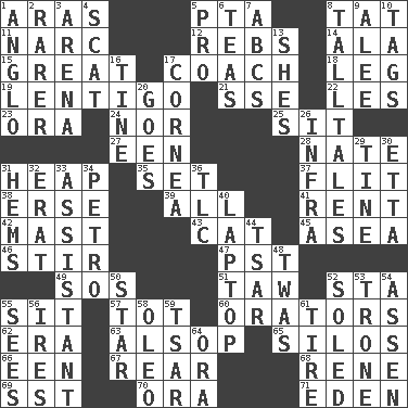 ACROSS 1. Caspian sea tributary 5. Parent Teacher Assoc. 8. Make lace 11. Drug cop 12. Confederate soldiers (slang) 14. Chicken ___ king 15. Relatively large 17. Team commander 18. Part of a journey 19. Small, flat, pigmented spot on the skin 21. Compass dir. 22. French article 23. Mouth or opening 24. Not either 25. Be seated 27. Car or cant ending 28. Nathan's nickname 31. Pile 35. Arrange properly for use 37. Secret move to avoid paying debts 38. Celtic language 39. 100% 41. Monthly bill 42. Vertical spar for supporting sails 43. Domesticated feline 45. Toward the sea 46. Use a spoon 47. Pacific Standard Time (abbr.) 49. Distress signal 51. The 23rd letter of the Hebrew alphabet 52. R.R. building 55. Be seated 57. Small child 60. Speakers 62. Period 63. Columnist Joseph or Stewart 65. Grain storage towers 66. Car or cant ending 67. Hitchcock's "____ Window" 68. French philosopher Descartes 69. Fast jet (abbr.) 70. Mouth or opening 71. Locale of original sin DOWN 1. White American of non-Hispanic descent 2. More valued for its uncommonness 3. Sports stadium 4. Scram! 5. Adept person 6. Beverages made from leaves 7. Lettered men learn these first 8. Baron Munchausen's specialties 9. Toward shelter 10. Labels 13. "______ My Girl" (Turtles hit) 16. Prong on a fork 17. Pupil covering 20. Leaves 26. Kind of red light 29. Prong on a fork 30. Singer James 31. Is hesitant and indecisive 32. Part of Q.E.F. 33. Helper 34. Stone: prefix 36. Affectionate concern, for short 40. Portable computer 44. Russian ruler of old 48. It was, poetically 50. Play the lead 52. Having a sole or soles 53. Marketplace scale 54. NE Netherlands city 55. Observes 56. Angers 58. Butter sub 59. Russian ruler of old 61. Hoop that covers a wheel 64. Mouth or opening