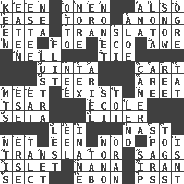 ACROSS 1. Peachy ____! 5. Sign of something about to happen 9. In addition 13. Comfort 14. "Corrida" creature 15. Amid 16. Singer James 17. Interpreter 19. Born 20. Enemy 21. Environmental prefix 22. Deep reverence 23. 1994 drama film starring Jodie Foster 25. Make a knot 26. National forest in Provo, Utah 30. Haul 34. Navigate 35. Type of rug 36. Rendezvous 39. Be extant 42. Rendezvous 43. Russian ruler of old 44. Learning spot: Fr. 46. Stalk of a moss capsule 47. 61 cubic inches 48. Flowery wreath 51. Political cartoonist Thomas 54. Fish or hair follower 57. Car or cant ending 58. Lower and raise head in agreement 60. Luau course 62. Interpreter 65. Sinks 66. Small island 67. Grandmother 68. SW Asia republic 69. Religious group 70. Inky black, to poets 71. Inconspicuous attention getter DOWN 1. Peachy ____! 2. Eroded 3. First name in cosmetics 4. Teachers' org. 5. "Beetle Bailey" pooch 6. Greater amount 7. Period 8. Music written for nine 9. Nanny (var.) 10. Globular water bottle used in Asia 11. Overwhelm 12. Legendary monster 15. Medicinal plant 18. _-fi 20. Secret move to avoid paying debts 24. A period of five years 27. Born 28. John Ritter's dad 29. Satellite of Uranus 30. Device for capturing images 31. "We ___ not amused" (Victoria) 32. Portuguese money of account (variant) 33. Make lace 36. Mountains (abbr.) 37. Compass dir. 38. Consume 40. _-fi 41. Small child 45. Grant temporary use of 48. For fear that 49. Snakelike fish 50. Empty; void 52. Practice fights 53. Ancient Roman robes 54. Nuclear Threat Initiatives 55. Celtic language 56. Baby powder 58. Words to Nanette 59. Northwest Algerian city 61. Is not 63. Fish or hair follower 64. Keyboard key 65. Small drink