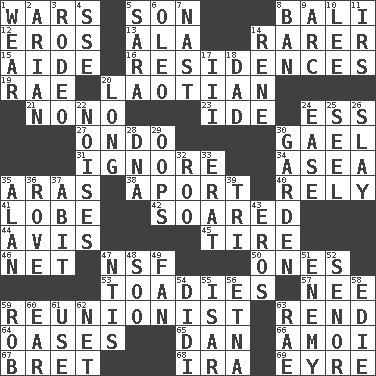 ACROSS 1. Armed conflicts 5. Manchild 8. Indonesian resort city 12. Greek god of love 13. In the manner of 14. More uncommon 15. Assistant 16. Dwellings 19. Actress Charlotte 20. Of or relating to Laos or its people 21. Words to Nanette 23. Binary compound 24. Double-curved letter 27. Southwest Nigerian state 30. Highlander 31. Snub 34. At sea 35. Caspian sea tributary 38. To the left, to Queeg 40. Have trust in 41. Ear part 42. Flew 44. Deliberation 45. Hoop that covers a wheel 46. Fish or hair follower 47. Overdraft (abbr.) 50. Singles 53. Sycophants 57. Born 59. One who advocates reunion 63. Tear apart 64. Fertile tracts in a desert 65. Daniel's nick name 66. Mine, in Marseilles 67. Cy Young winner Saberhagen 68. Retirement account (abbr.) 69. Jane of fiction DOWN 1. Erode 2. Believer in; advocate of (suffix) 3. Cowboy competition 4. Compass dir. 5. "Two Mules for Sister ____" 6. Margarine 7. Political cartoonist Thomas 8. Bar 9. Curve 10. Area sheltered from the wind 11. Big collection agency 14. French philosopher Descartes 17. One more than two 18. Male parent 20. Yearn 22. Annoying sounds 24. Relaxation 25. Sew up the eyelids of hawks and falcons 26. Kill 28. Heredity factor (abbr.) 29. I made a mistake 30. Place where plants grow 32. Friend of Pooh 33. Part of Q.E.F. 35. Actor Alda or Thicke 36. Be footloose 37. "This won't hurt ____!" 39. Three (prefix) 43. Greek god of love 47. Nuclear Threat Initiatives 48. "Barney Miller" actor Jack 49. Air blower 51. Foe 52. Sir (Sp.) 54. "You Light Up My Life" star Conn 55. Astrian river, tributary to the Danube 56. Inactive volcano in Sicily 58. Singer Brickell 59. Director Reiner 60. Ewer handle 61. Purpose 62. Fish or hair follower 63. Actress Charlotte
