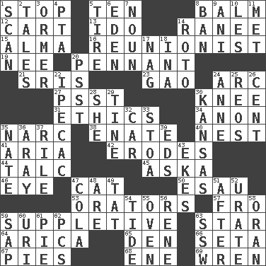 ACROSS 1. Close up, plug up 5. "___ Little Indians" 8. Lip ointment 12. Draw slowly or heavily 13. Wedding promise 14. The wife of a rajah (variant) 15. _ mater 16. One who advocates reunion 19. Born 20. Pre-World Series prize 21. Indian titles of respect 23. E Mali city 24. Curve 27. Inconspicuous attention getter 30. Leg joint 31. Principles of right and wrong 34. Soon (poet.) 35. Drug cop 38. Related on the mother's side 40. A home for chicks 41. Operatic vocal solo 42. Eats (away) 44. Baby powder 45. "____ silly question..." 46. Sight organ 47. Domesticated feline 50. He sold his birthright 53. Speakers 57. Back 59. Supplying deficiencies 63. Play the lead 64. N. Chile seaport 65. Lair 66. Stalk of a moss capsule 67. Sliced desserts 68. Compass dir. 69. Songbird DOWN 1. Examine hastily 2. Lies 3. Abalone 4. Parent Teacher Assoc. 5. Become fatigued 6. Paradise 7. Part of speech 8. Prohibit 9. Black tropical American cuckoo 10. French article 11. Was introduced to 14. Printing process, for short 17. Tired old horse 18. _ tizzy (2 wds.) 20. Inconspicuous attention getter 22. Medicinal drug used to evoke vomiting 24. Singer Murray 25. Vintage cars 26. Penny 28. A female animal or person 29. Prong on a fork 30. Sunflower state 32. Auto 33. Portico 35. Nathan's nickname 36. Like ___ of sunshine 37. Cause heat under the collar 39. Begley and Asner 43. Supplements with great effort 47. Root beer relative 48. "We ___ not amused" (Victoria) 49. Make lace 51. Following 52. A salt of uric acid 54. Event that recurs at intervals 55. Baking chamber 56. French philosopher Descartes 58. Northwest Algerian city 59. Plant excrement 60. RI univ. 61. Sliced dessert 62. Personal Computers (abbr.) 63. Compass dir.
