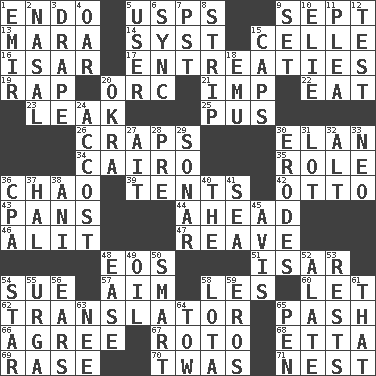 ACROSS 1. Inside; within (prefix) 5. United States Postal Service (abbr.) 9. Back-to-school mo. 13. Hindu Mythology: god of death 14. System (abbr.) 15. Cell (Danish) 16. Astrian river, tributary to the Danube 17. Pleas 19. Reproach for some lapse or misdeed 20. The grampus (Milton) 21. Naughty child 22. Consume 23. Path through which fluid escapes 25. Fluid product of inflammation 26. Dice game 30. Flair 34. Capital of Egypt 35. Hero or heavy, e.g. 36. US Secretary of Labor Elaine L. _ 39. Portable shelters 42. "Beetle Bailey" pooch 43. Baking dishes 44. Toward the future 46. Set down 47. Break or tear apart 48. Greek goddess of the dawn 51. Astrian river, tributary to the Danube 54. Take to court 57. Direct toward a target or goal 58. French article 60. Allow 62. Interpreter 65. Romantic infatuation 66. Match 67. Printing process, for short 68. Singer James 69. To erase 70. It was, poetically 71. Egg locale DOWN 1. Independent ruler or chieftain 2. Rhinal 3. Window treatment 4. Rowing implement 5. One who uses or employs something 6. Synchronize (abbr.) 7. Pacific Standard Time (abbr.) 8. Empty completely 9. Put into a specified state 10. Writer Wiesel 11. Entreaty 12. Trial 15. Balmoral and tarboosh 18. Australian flightless bird 20. Gumbo ingredient 24. Buttonhole 27. Small island 28. Before (prefix) 29. Echolocation 30. Eats (away) 31. Car dealer's back yard 32. The first octave above the treble staff 33. Modern: prefix 36. Numbers guy (abbr.) 37. Actor Linden 38. Black tropical American cuckoo 40. Definite Article 41. Ocean 45. Deliberation 48. Comfort 49. Petroleum 50. Don Adams' spy role 52. Having winglike extensions 53. Musical pauses 54. Play the lead 55. Capital and largest city of Mongolia 56. Hearing organs 58. Globular water bottle used in Asia 59. Greek god of love 61. Not this but _ 63. Born 64. Pull behind 65. Writing instrument