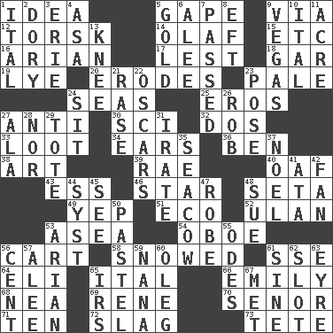 ACROSS 1. It may be bright or harebrained 5. Yawn 9. By way of 12. Cod relative 14. Norwegian king 15. And so on (abbr.) 16. Believer in; advocate of (suffix) 17. For fear that 18. Slender fish 19. Potassium hydroxide 20. Eats (away) 23. Diluted with white 24. Oceans 25. Greek god of love 27. Against 30. _-fi 32. Two (Sp.) 33. Plunder 34. Hearing organs 36. Benjamin's nick name 38. Nonscientific branch of learning 39. Actress Charlotte 40. Clumsy lout 43. Curvy letter 46. Play the lead 48. Bristle 49. Slangy assent 51. Environmental prefix 52. ____ Bator, Mongolia 53. Toward the sea 54. Mitch Miller's instrument 56. Heavy open wagon 58. Frozen precipiation fell 61. Compass dir. 64. Biblical high priest 65. Slanted text style (abbr.) 66. Poet Dickinson 68. Teachers' org. 69. French philosopher Descartes 70. Sir (Sp.) 71. "___ Little Indians" 72. Volcanic refuse 73. Wig DOWN 1. Slanted text style (abbr.) 2. Dinghy 3. One of the Great Lakes 4. White ___ sheet 5. Aureate 6. Toward shelter 7. Went by 8. Bank Draft (abbr.) 9. Viva Las _ 10. Slanted text style (abbr.) 11. Land measure 13. Leg joint 21. To erase 22. Motion picture awards 23. Introduce or present, as a question 24. Be seated 26. Director Reiner 27. Chicken ___ king 28. Or not 29. Carryall 31. Feeling or showing extreme anger 35. Manatee 37. Christmas carol 41. "One Day ___ Time" 42. Avid follower 44. System (abbr.) 45. Perceive with the eye 47. Loose flowing garment 48. Institute legal proceedings 50. Soft color 53. Believer in; advocate of (suffix) 55. Lyric poems 56. Penny 57. Toward shelter 59. Grandmother 60. Cassini of fashion 61. Trig term 62. Narrow, elongated depression 63. Jane of fiction 65. Big collection agency 67. Was introduced to