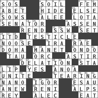 ACROSS 1. Mayday 4. The visible part of the earth's surface 8. Opposite of masc. 11. Collude with 13. Flintstone garb 14. Otherwise 15. Sty mamas 16. Toward shelter 17. Globular water bottle used in Asia 18. Legislator 21. NE Netherlands city 22. Tear apart 23. Compass dir. 25. Put into a specified state 26. It would 29. One of the two male reproductive glands 32. Trap for birds or small mammals 34. Lyricist Gershwin 35. Actress Charlotte 38. Capital of the state of Qatar 39. French painter Edouard 41. Southwest Nigerian state 43. The 19th letter of the Greek alphabet 44. The grampus (Milton) 45. Being in motion 46. Accusation by an informer 50. R.R. building 51. Mouth edge 54. It is so 55. Small Philippine buffalo 57. Join together 59. Lacerating 63. Billionth: prefix 64. Composer Stravinsky 67. Son of Isaac 68. Afresh 69. Painter Guido (1575-1642) 70. High mountains 71. Marina Del _, California 72. Actor Baldwin 73. Consume DOWN 1. Backtalk 2. Mitch Miller's instrument 3. Stitched 4. Pottery fragments 5. Lubricate 6. Binary compound 7. Area sheltered from the wind 8. Soft thread for cleaning between teeth 9. First name in cosmetics 10. Intended 12. Russian ruler of old 14. Raised railways 19. False hair 20. Single 21. Leather borer 23. Male parent of an animal 24. Jazz singing style 26. Working for oneself (abbr.) 27. A blast of a horn 28. Capital of the state of Qatar 30. A color or tint 31. Greek god of love 33. Saudi Arabian king (1953-1964) 36. Pismires 37. Prepare for publication 39. Undercover agent 40. Caspian sea tributary 42. Mouth or opening 45. Small Philippine buffalo 47. Sight organ 48. Of or pertaining to medicine 49. Single 51. Type of eclipse 52. Silly 53. Abounding in pines 56. Length times width 58. Pull behind 60. Small island 61. California wine valley 62. Abrupt rush of wind 64. Lyricist Gershwin 65. Set 66. Single