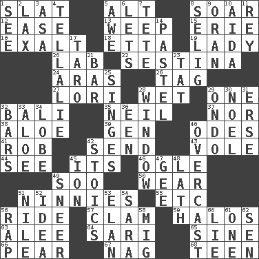 ACROSS 1. Narrow board 5. Keyboard modifier key 8. Fly high 12. Relaxation 13. Shed a tear 15. One of the Great Lakes 16. Honor 18. Singer James 19. Kenny Rogers chart-topper in '80 20. Experiment locale 22. French poetic form 24. Ancient river in northeast Turkey 26. Label 27. Australian parrot (variant) 28. Soggy 29. Single 32. Indonesian resort city 35. Famous astronaut Armstrong 37. And not 38. _ vera 39. Commissioned mil. rank 40. Lyric poems 41. Director Reiner 42. Transmit 43. Short-tailed, large-bodied rat 44. Perceive with the eye 45. It is 46. Stare at amorously 49. "Barney Miller" actor Jack 50. Erode 51. Fools 55. And so on (abbr.) 56. Travel on an animal 57. Burrowing marine mollusk 59. Saint headwear 63. Toward shelter 64. Indian skirt 65. Trig term 66. Lightbulb-shaped fruit 67. Tired old horse 68. Adolescent DOWN 1. Observe 2. Not strict 3. White ___ sheet 4. Copy Pinocchio 5. Deep reverence 6. Allows 7. Wig 8. Major League Baseball Commissioner Bud 9. Northwest Algerian city 10. Opera by Verdi 11. Marina Del _, California 14. Soft color 17. Pacific island yam 21. Long, evenly shaped piece 23. Make lace 25. Scorches 28. Light entry point 29. Southwest Nigerian state 30. Christmas carol 31. Celtic language 32. Taverns 33. _ vera 34. Ear part 36. Car or cant ending 40. Cloudy 42. Unemotional ones 45. Electrically charged atom 47. Turn to the right 48. Thin strip of wood or metal 49. Contemptuous expression 51. The longest river in the world 52. It may be bright or harebrained 53. Enthusiasm 54. "Two Mules for Sister ____" 56. Hit sharply and swiftly 58. Russian fighter aircraft 60. Falsehood 61. Single 62. Elected rep.