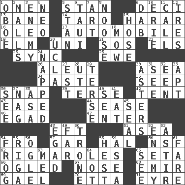 ACROSS 1. Sign of things to come 5. Comedian Laurel of Laurel & Hardy 9. Tenth: prefix 13. Object of repulsion 14. Pacific island yam 15. Ethiopian city, capital of Harari 16. Butter sub 17. Car 19. Shade tree 20. Single; one (prefix) 21. Distress signal 22. Raised railways 23. Synchronize (abbr.) 25. She-sheep 26. Eskimo relative 30. Toward the sea 34. Thick mixture 35. Ooze 36. Fastener 39. Laconic 42. Portable shelter 43. Relaxation 44. Gospel singer Marvin 46. Mild oath 47. Keyboard key 48. Lizard (obsolete) 51. At sea 54. From 57. Slender fish 58. Actor Linden 60. Science/research agcy. 62. Frustrating wastes of time 65. Stalk of a moss capsule 66. Stared 67. Olfactory organ 68. Independent ruler or chieftain 69. Highlander 70. Singer James 71. Jane of fiction DOWN 1. Mitch Miller's instrument 2. Shopping centers 3. Foe 4. Modern: prefix 5. Comedian Laurel of Laurel & Hardy 6. "Change" in Tahitian 7. Tate display 8. Trap for birds or small mammals 9. Small moist lump or mass 10. 4th largest of the Great Lakes 11. Give a ring to 12. Angers 15. Flexible conduit 18. Cut the grass 20. Southern CA. univ. 24. Slept 27. Eastern Standard Time (abbr.) 28. Shoshoni 29. Laconic 30. Michaelmas daisies 31. Perceive with the eye 32. Car or cant ending 33. Fitting 36. Observe 37. Tired old horse 38. White ___ sheet 40. Elected rep. 41. Erode 45. Lick closed 48. Mild oath 49. At a great distance 50. Marketplace scale 52. Foe 53. Being in motion 54. Tree-dwelling hopper 55. Capital of Latvia 56. Stare at amorously 58. Behest 59. At sea 61. Conductor's collection 63. Cartoonist voice _ Blanc 64. Car dealer's back yard 65. Perceive with the eye