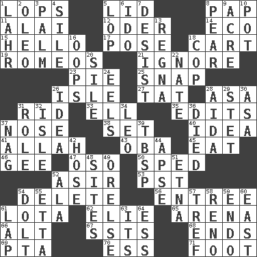 ACROSS 1. Chops off 5. Hat (slang) 8. Infant food 11. Jai _ 12. Baltic tributary 14. Environmental prefix 15. Phone greeting 17. Introduce or present, as a question 18. Haul 19. Lover boys 21. Dismiss 23. Sliced dessert 25. Fastener 26. Capri or Wright 27. Make lace 28. White ___ sheet 31. To free from 33. Pipe bend 35. Proofreads 37. Characteristic smell of wine 38. Put into a specified state 40. The content of cognition 41. Assad's deity 43. Chief or king in Benin or Nigeria 45. Erode 46. Turn to the right 47. Bear (Spanish) 50. Moved rapidly 52. SW Saudi Arabia district 53. Pacific Standard Time (abbr.) 54. Erase 56. Main course 61. Globular water bottle used in Asia 62. Writer Wiesel 65. Sports stadium 66. Keyboard modifier key 67. Fast planes 68. Conclusions 69. Parent Teacher Association (abbr.) 70. Double-curved letter 71. 12 inches DOWN 1. Cowardly lion portrayer 2. Butter sub 3. Inside of hand 4. Drop; flow; fall 5. Trim (branches) 6. Wedding promise 7. Stop 8. Lightbulb-shaped fruit 9. Measure of real estate 10. Plant holder 13. Rain (Swedish) 16. I made a mistake 18. Police officer (slang) 20. Drop; flow; fall 22. Nathan's nickname 24. Snakelike fish 26. The main thing one is thinking about 28. Opera by Verdi 29. Proofreading order 30. White ___ sheet 31. Hero or heavy, e.g. 32. Small island 34. Lion 36. Passed on 37. Tired old horse 39. Cook's measure (abbr.) 42. Stockings 44. Domed church section 48. Locates 49. Threatening words 51. Inactive volcano in Sicily 52. In the manner of 54. Stupid person 55. Singer James 57. Not kosher 58. Western Nevada city 59. Inside; within (prefix) 60. 90 degrees 61. Pet locale 63. It is 64. Curvy letter