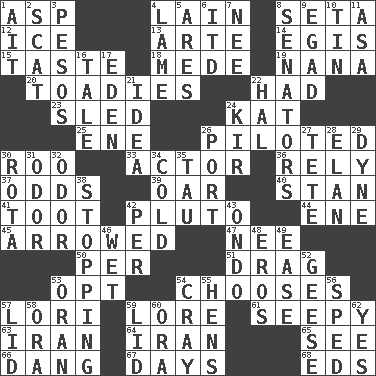 ACROSS 1. Cleo's killer 4. (Had) reclined 8. Bristle 12. Frozen water 13. Johnson of "Laugh-In" 14. Armor plate that protects the chest 15. Clothes sense 18. Ancient Persian 19. Nanny 20. Sycophants 22. Possessed 23. Downhill vehicle 24. Krazy ___ of comics 25. Compass dir. 26. Manned the helm 30. Friend of Pooh 33. Thespian 36. Trust 37. Likelihood 39. Boat paddle 40. Comedian Laurel of Laurel & Hardy 41. A blast of a horn 42. Mickey's pet 44. Compass dir. 45. Moved like an arrow 47. Born 50. For each 51. To trail on the ground 53. Elect 54. Elects 57. Australian parrot (variant) 59. Old wives' tales, e.g. 61. Oozy 63. SW Asia republic 64. SW Asia republic 65. Observe 66. Mild oath, euphamism for damn 67. 24-hour periods 68. Begley and Asner DOWN 1. Small island 2. Leave at once 3. Mexican monetary units 4. Unable to walk 5. Ancient Greek god of war 6. It would 7. Born 8. Elected representatives 9. Mild oath 10. Metal container 11. White ___ sheet 16. Lie 17. Genesis locale 21. The main thing one is thinking about 22. Actor Linden 24. Apertif with cassis 26. Left side of a ship or aircraft 27. Wig 28. Flair 29. Centimeter-gram-second unit of force 30. Roll call or roster of names 31. Scent 32. Aroma 34. Having a low temperature 35. The 19th letter of the Greek alphabet 38. Obstructing or blocking passage 42. For each 43. Southwest Nigerian state 46. Dripping 48. Greek god of love 49. Relaxation 52. Honkers 53. Northwest Algerian city 54. Supercomputer manufacturer 55. Coop moms 56. Broke a traffic law 57. Flaplike covering 58. Mouth or opening 59. Hat (slang) 60. Mouth or opening 62. It is so