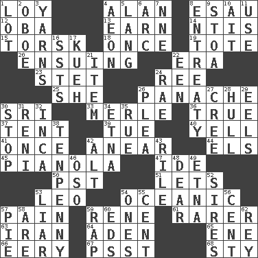 ACROSS 1. Myrna of the movies 4. Actor Alda or Thicke 8. Son of Isaac 12. Chief or king in Benin or Nigeria 13. Merit 14. Nuclear Threat Initiatives 15. Cod relative 18. At one time in the past 19. Haul 20. Following as a consequence or result 22. Period 23. Proofreading order 24. Portuguese money of account (variant) 25. A female animal or person 26. Flamboyance 30. Indian title of respect (Mr.) 33. Haggard of country music 36. Loyal 37. Portable shelter 39. Third day of the wk. 40. Shout 41. At one time in the past 42. Approach 44. Raised railways 45. Player piano 47. Binary compound 50. Pacific Standard Time (abbr.) 51. Allows 53. Lion 54. Pertaining to the sea 57. Ache 59. French philosopher Descartes 61. More valued for its uncommonness 63. SW Asia republic 64. An important port of Yemen 65. Compass dir. 66. Suggestive of the supernatural 67. Inconspicuous attention getter 68. Filthy place DOWN 1. Car dealer's back yard 2. Mitch Miller's instrument 3. Tall tales 4. A really long time 5. Austrian-born American filmmaker Fritz 6. Curve 7. Compass dir. 8. Plea 9. Portico 10. Small island 11. Purpose 16. Fast planes 17. Malaysian steamed pastry 21. A distinct part 22. Car or cant ending 24. Actress Charlotte 26. Entreaty 27. Algonquian 28. Frame or body of a ship 29. Snakelike fish 30. Obstruct or block passage 31. Painter Guido (1575-1642) 32. South American Indian 34. Inactive volcano in Sicily 35. Sorrow 38. 3-inch nail 42. The first octave above the treble staff 43. Cause heat under the collar 46. Bear (Spanish) 48. Letter starter 49. Inactive volcano in Sicily 52. Founders of families 53. One who doesn't tell the truth 54. Washington bills 55. Penny 56. Penny 57. Sliced dessert 58. "We ___ not amused" (Victoria) 59. Reproach for some lapse or misdeed 60. Begley and Asner 62. Marina Del _, California