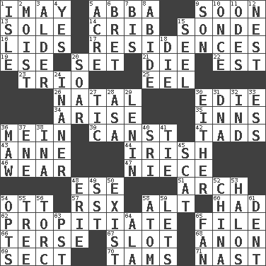 ACROSS 1. "If ____ say so..." 5. Swedish rock group 9. Within a short period 13. Not divided or shared with others 14. Baby bed with high sides 15. Message 16. Flaplike coverings 17. Dwellings 19. Compass dir. 20. Put into a specified state 21. Expire 22. Eastern Standard Time (abbr.) 23. Musical group of three 25. Snakelike fish 26. Brizilian seaport 30. Singer Brickell 34. Ascend 35. Lodging establishments 36. Chow _ 39. 2nd pers. sing. pres. of can (arch.) 42. Bits 43. Queen of England 1702-14 44. From or relating to Ireland 46. Put on (as clothing) 47. Sibling's daughter 48. Compass dir. 51. Bowlike part 54. Baseball player Mel 57. Acura sports coupe 58. The first octave above the treble staff 60. Possessed 62. Conciliate 65. Do some clerical work 66. Laconic 67. Groove 68. At once, immediately (arch.) 69. Religious group 70. Scottish caps 71. Political cartoonist Thomas DOWN 1. Capri or Wright 2. Wet 3. Tree or shrub in the Birch family 4. Consenting reply 5. 1/640 square mile 6. Cy Young winner Saberhagen 7. Again 8. Tolerate 9. Manchild 10. Single time 11. Lyric poems 12. A home for chicks 15. Stitch closed the eyes of (a falcon) 18. Expire 20. Fly high 24. Sillier 27. Nervous spasm 28. White ___ sheet 29. Soviet premier 1918-24 30. One or the other of two 31. Heredity factor (abbr.) 32. Indiana (abbr.) 33. Double-curved letter 36. Opening into something insatiable 37. Compass dir. 38. _ tizzy (2 wds.) 40. Indian title of respect (Mr.) 41. Make a knot 45. Go away! 48. One of the Great Lakes 49. Fast jet (abbr.) 50. Be extant 52. Large country 53. Auras 54. Chooses 55. Family _ (genealogy) 56. Torque (variant) 58. Smallest unit of an element 59. Allows 61. Incision 63. Pacific Standard Time (abbr.) 64. In the manner of 65. Air blower