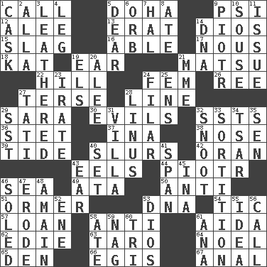 ACROSS 1. Give a ring to 5. Capital of the state of Qatar 9. 23rd letter of the Greek alphabet 12. Toward shelter 13. Part of Q.E.F. 14. "Vaya con ____" 15. Volcanic refuse 16. Competent 17. Horse sense 18. Krazy ___ of comics 19. Ewer handle 21. Taiwanese island in East China Sea 22. Land elevation 24. Opposite of masc. 26. To riddle 27. Laconic 28. Actor's bit 29. "Two Mules for Sister ____" 30. Vices 32. Fast planes 36. Proofreading order 37. _ tizzy (2 wds.) 38. Characteristic smell of wine 39. Periodic rise and fall of the sea level 40. Runs notes together 42. Northwest Algerian city 43. Snakelike fish 44. Peter (Polish) 46. Ocean 49. _ moment's notice (2 wds.) 50. Opposed to 51. Abalone 53. Heredity factor (abbr.) 54. Nervous spasm 57. Grant temporary use of 58. Against 61. Opera by Verdi 62. Singer Brickell 63. Edible starchy tuberous root 64. Christmas carol 65. Lair 66. The front part of a cuirass 67. Of or related to the anus DOWN 1. Keg 2. Silent film actress Nazimova 3. Resembling or made to resemble leather 4. Part of a journey 5. Letter starter 6. Globe 7. Actor Linden 8. Had dinner 9. Peter (Polish) 10. Boozer 11. Come out of 14. Heredity factor (abbr.) 19. Raised railways 20. Toward shelter 21. Madame (abbr.) 23. Feeling or showing extreme anger 24. Having threads 25. Followers of ems 27. Jacques of French films 28. "_ and Lucy" (Charlie Brown theme song) 29. Fast jet (abbr.) 31. Country residence 32. Snob 33. Casting lots 34. Russian ruler of old 35. Elected rep. 40. Arrange properly for use 41. Connect, as a bridge 43. Hearing organ 45. _ tizzy (2 wds.) 46. Having a sole or soles 47. Eat (away) 48. At full speed 52. Compass dir. 53. "Vaya con ____" 55. The main thing one is thinking about 56. Give a ring to 58. Had dinner 59. Tired old horse 60. Three (prefix) 61. Santa ___, CA