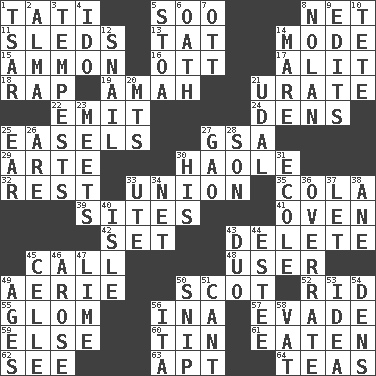 ACROSS 1. Jacques of French films 5. "Barney Miller" actor Jack 8. Fish or hair follower 11. Bobsleighs 13. Make lace 14. Method 15. ID or VA city 16. Baseball player Mel 17. Set down 18. Reproach for some lapse or misdeed 19. Wet nurse 21. A salt of uric acid 22. Send forth 24. Hiding places for outlaws 25. Artist's stands 27. Girls' org. (abbr.) 29. Johnson of "Laugh-In" 30. White Person, in Hawaii 32. Remainder 33. The state of being joined or united 35. Root beer relative 39. Locates 41. Baking chamber 42. Put into a specified state 43. Erase 45. Give a ring to 48. One who makes use of a thing 49. Nest on high 50. Highlander 52. To free from 55. Take by theft 56. _ tizzy (2 wds.) 57. Elude 59. Otherwise 60. Shallow baking pan 61. Consumed 62. Observe 63. Fitting 64. Beverages made from leaves DOWN 1. Russian ruler of old 2. _ mater 3. Storms 4. Wedding promise 5. Portico 6. Pledge 7. Baseball player Mel 8. Pitcher Ryan 9. Prepares for publication 10. False hair 12. Slow-paced one 14. Female horse 20. Mountains (abbr.) 21. Freehold land 23. Confronts 25. Hearing organ 26. "We ___ not amused" (Victoria) 27. E Mali city 28. Manchild 30. Part of HMS, perhaps 31. Learning spot: Fr. 33. Shoshoni 34. Fish or hair follower 36. Make much ado about nothing 37. Allow 38. A saturated hydrocarbon 40. Small island 43. Superhero pair 44. First name in cosmetics 45. Cell (Danish) 46. Came up 47. Welles in "The Third Man" 49. Grows older 50. Clip 51. Patter 53. The content of cognition 54. Habitations of wild animals 56. Call ___ day 58. Large container