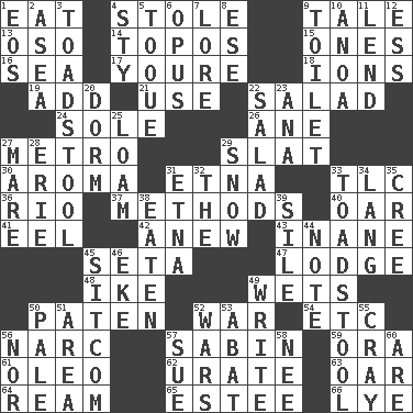 ACROSS 1. Ingest 4. Fur scarf 9. Falsehood 13. Bear (Spanish) 14. Literary convention 15. Singles 16. Ocean 17. You are 18. Charged atoms 19. Increase 21. Purpose 22. First course 24. Not divided or shared with others 26. A saturated hydrocarbon 27. Paris' subway 29. Narrow board 30. Odor 31. Inactive volcano in Sicily 33. Affectionate concern, for short 36. _ de Janeiro 37. Modes 40. Rowing implement 41. Snakelike fish 42. Afresh 43. Empty; void 45. Stalk of a moss capsule 47. Inn 48. D.D.E's nickname 49. Moistens 50. Eucharist need 52. Armed conflict 54. And so on (abbr.) 56. Drug cop 57. Unit of acoustic absorption 59. Mouth or opening 61. Margarine 62. A salt of uric acid 63. Rowing implement 64. 480, 500 or 516 sheets of paper 65. First name in cosmetics 66. Potassium hydroxide DOWN 1. Greek goddess of the dawn 2. At sea 3. Inedible or poisonous agaric 4. Filthy place 5. Woman's close-fitting hat 6. Musical composition 7. Old wives' tales, e.g. 8. Compass dir. 9. Bathroom 10. Small Philippine buffalo 11. Grant temporary use of 12. Double-curved letter 20. Dormintory (informal) 22. Vegetable dish 23. Santa ___, CA 25. Rich soil 27. Female horse 28. One of the Great Lakes 29. Overwhelm 31. Inactive volcano in Sicily 32. Definite Article 33. Inedible or poisonous agaric 34. Austrian-born American filmmaker Fritz 35. Algonquian 38. Ingested 39. Filth; sediment 44. Make mention of 45. "Cheers" or "Ellen" 46. Supplement with great effort 49. Compose 50. Diluted with white 51. Type of rug 52. Armed conflicts 53. Blind as ____ 55. Supercomputer manufacturer 56. Or not 57. Institute legal proceedings 58. Born 60. "We ___ not amused" (Victoria)