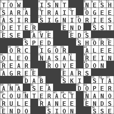 ACROSS 1. Pull behind 4. Is not 8. Soft 12. "Two Mules for Sister ____" 14. Distinguishing feature 16. Double curve, resembling the letter S 17. SW Saudi Arabia district 18. Seigniories (variant) 20. Prevent from occurring 22. Conclude 23. Fast jet (abbr.) 24. Compass dir. 25. "___ Maria" 28. Begley and Asner 30. Moved rapidly 31. Dinah or Pauly 35. The grampus (Milton) 37. Composer Stravinsky 40. Toward shelter 41. Butter sub 42. Relating to the nose 44. It's straight from the horse's mouth 45. Stern 46. Be footloose 47. Spanish title 48. Match 50. Hearing organs 52. Pat or tap gently 54. What Jean-Claude Killy likes to do 55. R.R. building 58. Santa ___, CA 61. Ocean 63. Drug addict 65. Neutralize 70. Billionth: prefix 71. General guideline 72. The wife of a rajah (variant) 73. Extremities 74. Inside; within (prefix) 75. The Jewish people; Israel 76. Compass dir. DOWN 1. Sadhe (variant) 2. Fertile tracts in a desert 3. Compose 4. It is 5. Indian title of respect (Mr.) 6. Tired old horse 7. Prong on a fork 8. Or not 9. The front part of a cuirass 10. Perceives with the eye 11. Command 13. "We ___ not amused" (Victoria) 15. Prong on a fork 19. Probability 21. Reproach for some lapse or misdeed 26. Distinctive style or manner 27. _ Allan Poe 29. Broken pieces 30. Tallied 32. Margarine 33. It's straight from the horse's mouth 34. Car or cant ending 35. Cassini of fashion 36. Posterior 38. Bear (Spanish) 39. All-night dance parties 41. Mouth or opening 43. Path through which fluid escapes 49. Compass direction 51. To free from 53. Fermented drink made from hops 55. Connects, as a bridge 56. Watches over 57. Came up 58. 1/640 square mile 59. Part of speech 60. Old (Scot.) 62. Ancient river in northeast Turkey 64. Single 66. Modern: prefix 67. Cuckoo 68. Corporate head (abbr.) 69. "___ Little Indians"