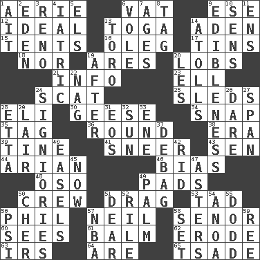 ACROSS 1. Nest on high 6. Large container 9. Compass dir. 12. Standard of perfection 13. Ancient Roman robe 14. An important port of Yemen 15. Portable shelters 16. Cassini of fashion 17. Canisters 18. And not 19. Ancient Greek god of war 20. Tennis shots 21. A message received and understood 23. Pipe bend 24. Get outta here! 25. Bobsleighs 28. Biblical high priest 30. Honkers 34. Fastener 35. Label 36. One shot 38. Period 39. Prong on a fork 41. Contemptuous expression 43. Elected rep. 44. Believer in; advocate of (suffix) 46. Prejudice 48. Bear (Spanish) 49. Writing tablets 50. Group working together 51. To trail on the ground 53. Bit 56. Silvers or Donahue 57. Famous astronaut Armstrong 58. Sir (Sp.) 60. Perceives with the eye 61. Lip ointment 62. Wear away 63. Big collection agency 64. "We ___ not amused" (Victoria) 65. Sadhe (variant) DOWN 1. Small island 2. Genesis locale 3. Western Nevada city 4. Of or pertaining to medicine 5. Raised railways 6. Grand slam 7. Matures 8. Label 9. The property of being fit to eat 10. Elected reps. 11. Followers of ems 13. "Corrida" creature 14. Ringlike coral islands and reefs 19. Following 20. French article 22. Tired old horse 24. Seigniories (variant) 26. Have the gumption 27. Connect, as a bridge 28. Singer James 29. Den 31. Greek goddess of the dawn 32. Player for Phoenix 33. Compass dir. 37. Debunk (Brit. slang) 40. Artist's stands 42. To free from 45. At this time 47. Michaelmas daisies 49. Inside of hand 50. "Mermaids" star 51. Letter starter 52. Cause heat under the collar 54. Small Philippine buffalo 55. Texas town _ City 56. 23rd letter of the Greek alphabet 57. Basketball assoc. 58. Put into a specified state 59. Portuguese money of account (variant)