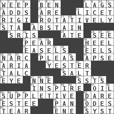 ACROSS 1. Shed a tear 5. Benjamin's nick name 8. Falls behind 12. Sums up 13. "We ___ not amused" (Victoria) 14. It is permitted: Lat. 15. Swiss mountan, "Queen of the Mountains" 16. Producing rotation 19. R.R. building 20. Choose not to consume 21. Indian titles of respect 23. Had dinner 24. Perceive with the eye 27. Lightbulb-shaped fruit 30. Person who is morally reprehensible 31. Artist's stands 34. Snakelike fish 35. Drug cop 38. Entreaties 40. Domed church section 41. Roberta Peters solo 42. Of or pertaining to yesterday 44. Baby powder 45. Table seasoning 46. Sight organ 47. Compass dir. 50. Fast planes 53. Stimulate to action 57. Petroleum 59. Supplying deficiencies 63. Have the gumption 64. First name in cosmetics 65. Baking dish 66. Lyric poems 67. Pull into pieces 68. Compass dir. 69. System (abbr.) DOWN 1. Armed conflicts 2. Prepares for publication 3. _ Allan Poe 4. Air pressure measure (abbr.) 5. Sharp remark 6. Greek god of love 7. Remaining after all deductions 8. 54 in ancient Rome 9. Adept person 10. Set 11. Filthy place 14. Actor's bit 17. Auto club (abbr.) 18. Teat (slang) 20. Toward the sea 22. Medicinal drug used to evoke vomiting 24. Ooze 25. Snakelike fish 26. Otherwise 28. Viper 29. Depend 30. Centers 32. Area sheltered from the wind 33. Backtalk 35. Nathan's nickname 36. Like ___ of sunshine 37. Cause heat under the collar 39. R.R. building 43. Otherwise 47. The longest river in the world 48. Compass dir. 49. Eastern Standard Time (abbr.) 51. Sycophant 52. Fathers 54. Corncob 55. "Terrible" tsar 56. French philosopher Descartes 58. For fear that 59. Put into a specified state 60. Purpose 61. Parent Teacher Assoc. 62. For each 63. Two (Sp.)