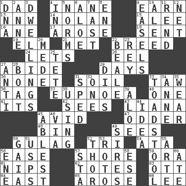 ACROSS 1. Male parent 4. Silly 9. Merit 13. Compass dir. 14. Pitcher Ryan 15. Toward shelter 16. A saturated hydrocarbon 17. Came up 18. Transmitted 19. Shade tree 21. Was introduced to 22. A special lineage 24. Allows 26. Snakelike fish 27. Stay 29. 24-hour periods 30. Music written for nine 31. The visible part of the earth's surface 33. The 23rd letter of the Hebrew alphabet 36. Label 37. Normal relaxed breathing 40. Single 41. ___ a Wonderful Life 42. Perceives with the eye 43. Woody, climbing, usually tropical plant 45. Enthusiastic 47. More peculiar 48. Storage container 49. Perceives with the eye 50. POW camp 52. Three (prefix) 54. "One Day ___ Time" 56. Relaxation 57. Dinah or Pauly 59. Mouth or opening 61. Cuts off 62. Lugs 63. Baseball player Mel 64. 90 degrees 65. Came up 66. Area sheltered from the wind DOWN 1. Heredity factor (abbr.) 2. Singer Murray 3. Homes 4. _ tizzy (2 wds.) 5. Typical standards 6. Medicinal plant 7. Political cartoonist Thomas 8. Compass dir. 9. Artist's stands 10. Toward shelter 11. Tear apart 12. Fish or hair follower 20. Ancient Persian 22. Memphis, Tenn. Street 23. Marina Del _, California 25. Wig 27. Opposed to 28. Water vessel 29. "Vaya con ____" 31. Moved rapidly 32. Single 33. Inedible or poisonous agaric 34. Queen of England 1702-14 35. Put on (as clothing) 38. Putting into practice 39. Medicinal plant 44. It may be bright or harebrained 45. Most capable 46. By way of 49. Begets 50. Greek goddess of the earth (variant) 51. United States Postal Service (abbr.) 52. Son of Odin 53. Printing process, for short 55. Johnson of "Laugh-In" 56. Compass dir. 57. R.R. building 58. Compass dir. 60. Had dinner