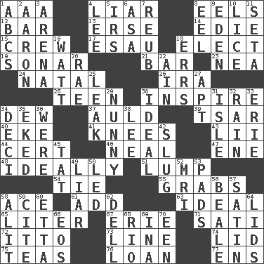 ACROSS 1. American Automobile Association (abbr.) 4. One who doesn't tell the truth 8. Snakelike fish 12. Tavern 13. Celtic language 14. Singer Brickell 15. Group working together 17. He sold his birthright 18. Opt 19. Underwater navigation system 21. Tavern 23. Teachers' org. 24. Brizilian seaport 26. Lyricist Gershwin 28. Adolescent 30. Heighten or intensify 34. Morning condensation 37. Old (Scot.) 39. Russian ruler of old 40. Supplement with great effort 41. Leg joints 43. Cards in a Roman deck? 44. An absolute certainty 46. Be tempered by heat 47. Compass dir. 48. Under perfect conditions 51. Mass 54. Neckwear 55. Seizes 58. Adept person 61. Find the sum of 63. Perfect 65. 61 cubic inches 67. One of the Great Lakes 71. Suttee (variant) 72. "Tell ____ the Marines!" 73. Actor's bit 74. Flaplike covering 75. Afternoon social gatherings 76. Grant temporary use of 77. Followers of ems DOWN 1. Lettered men learn these first 2. Composer Copland 3. Sports stadium 4. Area sheltered from the wind 5. Big collection agency 6. White ___ sheet 7. Reuben's nickname 8. Snakelike fish 9. Genesis locale 10. Louse (plural) 11. Stalk of a moss capsule 16. Electrical Unit 18. Blunders 20. Actress Charlotte 22. The 18th letter of the Arabic alphabet 25. Path through which fluid escapes 27. Fitting 29. Pet term 30. Perfect 31. Small island 32. Precipitation 33. One of the Great Lakes 34. Tenth: prefix 35. Made supply last 36. We are 38. Area sheltered from the wind 42. Snaillike creature with no shell 45. Make lace 49. One who doesn't tell the truth 50. Directed 52. Medical imaging device (abbr.) 53. Writing tablets 56. Calif. Air Force Base 57. Smooth fabric 58. Set down 59. Quote 60. Singer James 62. Small valley 64. Hats (slang) 66. Greek goddess of the dawn 68. _ de Janeiro 69. _ tizzy (2 wds.) 70. Car or cant ending