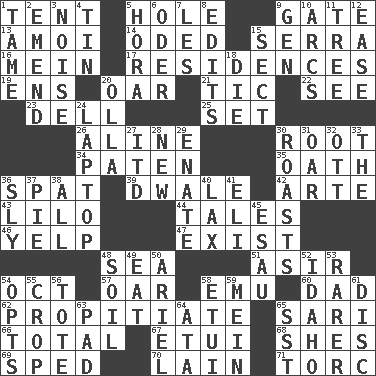 ACROSS 1. Portable shelter 5. Hollow 9. Yard entry 13. Mine, in Marseilles 14. Wrote a lyric poem 15. Father Junipero _ 16. Chow _ 17. Homes 19. Followers of ems 20. Rowing implement 21. Nervous spasm 22. Observe 23. Small valley 25. Put into a specified state 26. Place in a line 30. Carrot, for example 34. Eucharist need 35. Pledge 36. Argument over a trivial matter 39. A sleeping potion; an opiate (poet.) 42. Johnson of "Laugh-In" 43. _ and Stitch 44. Falsehoods 46. Sharp bark 47. Be 48. Ocean 51. SW Saudi Arabia district 54. Sep. follower 57. Rowing implement 58. Australian flightless bird 60. Male parent 62. Conciliate 65. Indian skirt 66. Add up to 67. Needle holder 68. "______ My Girl" (Turtles hit) 69. Moved rapidly 70. (Had) reclined 71. Torque (variant) DOWN 1. Docile 2. Make improvements or corrections to 3. Annoying sound 4. Metal container 5. Israeli folk dance 6. Baltic tributary 7. French article 8. Proofreads 9. Commissioned military rank (abbr.) 10. Arches 11. Woody plant 12. Relaxation 15. Religious group 18. Pass on 20. Spanish pot 24. Portable computer 27. It would 28. ___ Haven, CT 29. Related on the mother's side 30. Exposes to great heat 31. Boat paddle 32. Baseball player Mel 33. Definite Article 36. Secret 37. Sliced dessert 38. 100% 40. Not strict 41. Biblical high priest 45. Son of Isaac 48. The visible part of the earth's surface 49. Consume 50. Satellite of Uranus 52. Potato state 53. More uncommon 54. Chooses 55. Riding implement 56. Lug 58. Needle case 59. Chow _ 61. Plate 63. Writing tablet 64. "One Day ___ Time" 65. Fast jet (abbr.)