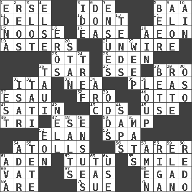 ACROSS 1. Celtic language 5. Binary compound 8. Sound made by sheep 11. Small valley 12. Do not 14. Biblical high priest 15. Trap for birds or small mammals 17. Relaxation 18. Period of immesurable duration 19. Michaelmas daisies 21. Undo the wiring of 23. Baseball player Mel 25. Genesis locale 26. Russian ruler of old 27. Compass dir. 28. Sis' sibling 31. Call ___ day 33. Teachers' org. 35. Entreaties 37. Son of Isaac 38. From 40. "Beetle Bailey" pooch 41. Smooth fabric 43. Music discs 45. Purpose 46. Three (prefix) 47. Compass dir. 50. Moist 52. Enthusiasm 53. Health resort 54. Ringlike coral islands and reefs 56. A viewer who gazes fixedly 61. An important port of Yemen 62. Ballerina skirt 65. Grin 66. Large container 67. Oceans 68. Mild oath 69. "We ___ not amused" (Victoria) 70. Take to court 71. Billionth: prefix DOWN 1. Pulitzer Prize-winning author Ferber 2. Vintage cars 3. Slit 4. Otherwise 5. Binary compound 6. ___ good deed 7. Follows as a consequence or result 8. Fermented drink made from hops 9. _ vera 10. The 18th letter of the Arabic alphabet 13. Is inclined (to) 16. Greek god of love 18. The 18th letter of the Arabic alphabet 20. Comedian Laurel of Laurel & Hardy 22. Shed a tear 24. Unclean, religiously 26. "Change" in Tahitian 28. Antes 29. Pace 30. Bear (Spanish) 31. Astrian river, tributary to the Danube 32. Jacques of French films 34. Curve 36. Central Nebraska county 37. Eastern Standard Time (abbr.) 39. Probability 42. 1994 drama film starring Jodie Foster 44. Plant excrements 48. Table seasonings 49. Follows as a consequence or result 51. Floor coverings 52. Age 54. The sixth month of the Jewish calendar 55. Wig 57. So be it 58. Capital of Latvia 59. Style 60. Redecorate 61. Actress Gardner 63. The 19th letter of the Greek alphabet 64. Purpose