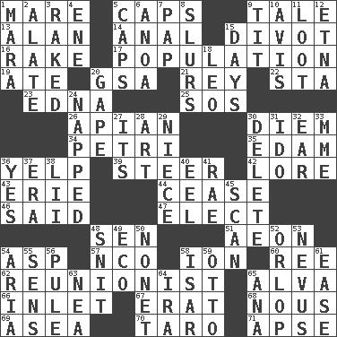 ACROSS 1. Female horse 5. Balmoral and tarboosh 9. Falsehood 13. Actor Alda or Thicke 14. Of or related to the anus 15. A piece of turf (Scot.) 16. Immoral or dissolute person 17. Census information 19. Had dinner 20. Girls' org. (abbr.) 21. Marina Del _, California 22. R.R. building 23. Pulitzer Prize-winning author Ferber 25. Distress signal 26. Bee-related 30. South Vietnam president (1954) 34. _ dish (used to culture cells) 35. Dutch treat 36. Sharp bark 39. Navigate 42. Old wives' tales, e.g. 43. One of the Great Lakes 44. Desist 46. Alleged 47. Choose 48. Elected rep. 51. Age 54. Viper 57. Non-commissioned officer (abbr.) 58. Electrically charged atom 60. Portuguese money of account (variant) 62. One who advocates reunion 65. Inventor's middle name 66. An arm off of a larger body of water 67. Part of Q.E.F. 68. Good sense 69. At sea 70. Pacific island yam 71. Domed church section DOWN 1. Hindu Mythology: god of death 2. Having winglike extensions 3. Moved through 4. Compass dir. 5. Balmoral and tarboosh 6. Small Philippine buffalo 7. Infant food 8. Runs notes together 9. Teat (slang) 10. Deliberation 11. Spoils 12. Inactive volcano in Sicily 15. 24-hour periods 18. Lion 20. Open wide 24. Slept 27. It is 28. Tate display 29. Sibling's daughter 30. Keyboard key 31. Wedding promise 32. Hearing organ 33. Madame (abbr.) 36. Consenting reply 37. Epoch 38. Cards in a Roman deck? 40. Snakelike fish 41. Actress Charlotte 45. Examine minutely or intensely 48. In a ____ (agitated or irritated) 49. Environmental prefix 50. Music written for nine 52. Lowest deck of a ship 53. Mole, birthmark 54. Operatic vocal solo 55. Elected reps. 56. Whimper 58. Astrian river, tributary to the Danube 59. "Beetle Bailey" pooch 61. Comfort 63. Teachers' org. 64. Lyricist Gershwin 65. Santa ___, CA