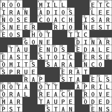 ACROSS 1. Friend of Pooh 4. Place where flour is made 8. And so on (abbr.) 11. SW Asia republic 13. Goodbye (Sp.) 15. Area sheltered from the wind 16. Sense of smell 17. Team commander 18. Astrian river, tributary to the Danube 19. Contemptuous expression 21. _ de Janeiro 22. A home for chicks 23. Greek goddess of the dawn 24. Being at a high temperature 27. Nervous spasm 29. Went 30. Middle Eastern gold or silver currency 34. The 19th letter of the Greek alphabet 36. Extremities 39. Peak District village in England 40. 90 degrees 41. Unemotional 43. Celtic language 44. Leaves out 46. "Two Mules for Sister ____" 47. Non-commissioned officer (abbr.) 48. Upset 49. Part of Q.E.F. 51. Strike 53. R.R. building 54. Raised railways 57. Roll call or roster of names 60. Baseball player Mel 63. Showery time 65. Of the mouth 66. Arrive at 69. Be footloose 70. Third mo. 71. Grayish beige 72. Wrote a lyric poem 73. Pacific Standard Time (abbr.) 74. Comedian Laurel of Laurel & Hardy 75. Followers of ems DOWN 1. Wash lightly 2. U. of Maine site 3. Fertile tracts in a desert 4. Big _ 5. Wedding promise 6. One who doesn't tell the truth 7. Locales 8. Otherwise 9. Beverages made from leaves 10. An absolute certainty 12. Born 14. Opportunity 18. Event 20. 17th letter of the Greek alphabet 25. Singles 26. Portable shelters 28. Binary compound 29. From the throat 31. Drug cop 32. In addition 33. To separate or throw off 34. Pack (down) 35. SW Saudi Arabia district 37. ___ good deed 38. Male parents of animals 40. Greek goddess of the dawn 42. Heavy open wagon 45. Ocean 50. Auto club (abbr.) 52. Sweet dark-red dessert wine 54. Wear away 55. Make or become more lively 56. Bobsleighs 57. Play 58. Mouths or openings 59. Small pie 61. Afternoon social gatherings 62. Drawn tight 64. Adept person 67. Numbers guy (abbr.) 68. Layer