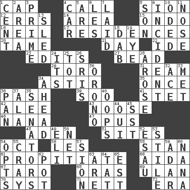 ACROSS 1. Head covering 4. Give a ring to 8. The Jewish people; Israel 12. Blunders 14. Type of rug 15. Southwest Nigerian state 16. Famous astronaut Armstrong 17. Dwellings 20. Docile 21. 24 hours 22. Binary compound 23. Prepares for publication 27. Necklace unit 29. "Corrida" creature 31. 480, 500 or 516 sheets of paper 34. Having gotten out of bed 35. At one time in the past 36. Romantic infatuation 39. "Barney Miller" actor Jack 41. Proofreading order 42. Toward shelter 43. Trap for birds or small mammals 46. Nanny 47. Musical composition 48. Arabian gulf 51. Locates 54. Sep. follower 56. French article 58. Comedian Laurel of Laurel & Hardy 61. Conciliate 66. Opera by Verdi 67. Edible starchy tuberous root 68. Mouths or openings 69. ____ Bator 70. System (abbr.) 71. Remaining after all deductions 72. Period DOWN 1. Penny 2. Type of rug 3. A-one 4. 4-wheeled motor vehicle 5. "We ___ not amused" (Victoria) 6. French article 7. Put down 8. Male child 9. Happening 10. Wrote a lyric poem 11. Characteristic smell of wine 13. Downhill vehicle 18. Apply (a substance) by light strokes 19. Sight organ 24. ___ a Wonderful Life 25. Small child 26. Indian titles of respect 28. Came up 30. U. of Maine site 32. Adept person 33. Was introduced to 34. Forward in time 36. Baking dish 37. Chicken ___ king 38. Elected representatives 40. I made a mistake 44. Fr. "Yes" 45. Fast jet (abbr.) 49. Connecticut Ivy Leaguer 50. Fish or hair follower 52. Son of Isaac 53. Vertical member of a panel or frame 54. Elects 55. Supercomputer manufacturer 57. The Jewish people; Israel 59. The sixth month of the Jewish calendar 60. Nanny 62. Cooking vessel 63. "We ___ not amused" (Victoria) 64. Make lace 65. Eastern Standard Time (abbr.)