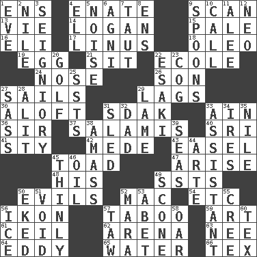 ACROSS 1. Followers of ems 4. Related on the mother's side 9. Examine hastily 13. Compete 14. Utah city north of Ogden 15. Light colored 16. Connecticut Ivy Leaguer 17. "_ and Lucy" (Charlie Brown theme song) 18. Butter sub 19. Oval reproductive body of a fowl 21. Be seated 22. Learning spot: Fr. 24. Sense of smell 26. Male offspring 27. Travel by water 29. Falls behind 30. Upward 31. Neighbor of Neb. 33. The 18th letter of the Arabic alphabet 36. Title for a knight 37. Deli grouping 40. _ Lanka 41. Filthy place 42. Ancient Persian 43. Artist's stand 45. Frog relative 47. Get up 48. Part of HMS, perhaps 49. Fast planes 50. Vices 52. Apple computer (short form) 54. And so on (abbr.) 56. Image 57. Off limits 59. Nonscientific branch of learning 61. To provide with a ceiling 62. Sports stadium 63. Born 64. Whirlpool 65. Wetness 66. John Ritter's dad DOWN 1. First lady 2. "Death on the ____" 3. Signiory (variant) 4. Pipe bend 5. Annoying sound 6. Hindu god of fire 7. Drawn tight 8. Followers of ems 9. Soup utensils 10. Give a ring to 11. Toward shelter 12. Modern: prefix 20. _ course 22. 1973 Nobel Price Winner (Physics) Leo 23. Gear tooth 25. Fast planes 27. Backtalk 28. Came down and settled, as after flight 29. Unable to walk 31. Downhill vehicle 32. Male parent 33. Helper 34. Angers 35. "Death on the ____" 38. Collect or gather 39. Oceans 44. Johnson of "Laugh-In" 45. Without force or sincere effort 46. Petroleum 49. Biscuitlike quick bread 50. Made supply last 51. Null 52. Hindu Mythology: god of death 53. Collude with 55. Algonquian 56. Frozen water 57. The 23rd letter of the Hebrew alphabet 58. Boat paddle 60. John Ritter's dad