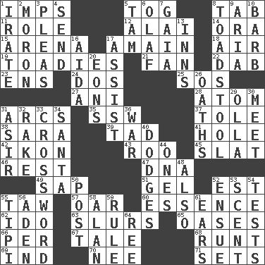 ACROSS 1. Naughty children 5. Coat; cloak 8. Keyboard key 11. Hero or heavy, e.g. 12. Jai _ 14. Mouth or opening 15. Sports stadium 17. At full speed 18. Atmosphere 19. Sycophants 21. Avid follower 22. Pat or tap gently 23. Followers of ems 24. Two (Sp.) 25. Mayday 27. Black tropical American cuckoo 28. Smallest unit of an element 31. Curves 35. Compass dir. 37. Lacquered or enameled metalware 38. "Two Mules for Sister ____" 39. Small boy 41. Hollow 42. Visual representation of an object 43. Friend of Pooh 45. Narrow board 46. Remainder 47. Heredity factor (abbr.) 49. Plant excrement 51. Set 52. Eastern Standard Time (abbr.) 55. The 23rd letter of the Hebrew alphabet 57. Rowing implement 60. Core 62. Wedding promise 63. Disparaging remarks 65. Fertile tracts in a desert 66. For each 67. Story 68. Undersized animal 69. Indiana (abbr.) 70. Born 71. Arranges properly for use DOWN 1. Feeling or showing extreme anger 2. Person of subnormal intelligence 3. Entreaties 4. Post 5. Scottish cap 6. Norwegian king 7. Greek goddess of the earth (variant) 8. Inedible or poisonous agaric 9. Roberta Peters solo 10. Sharp remark 13. Taverns 16. Opera by Verdi 17. Help 20. Immeasurably long periods of time 26. Expletives 29. Rounded earthenware pot or jar 30. Confront 31. SW Saudi Arabia district 32. Immoral or dissolute person 33. What you're doing now 34. Before Barbara or Clara 36. Armed conflict 40. Evades 44. Washington bills 48. In addition 50. Mail 52. Take place subsequently 53. Odor 54. Trials 55. Native american tent (variation) 56. Arabian gulf 58. ____ Jay Lerner 59. Governing power 61. Hearing organs 64. To riddle
