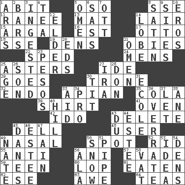 ACROSS 1. "This won't hurt ____!" 5. Bear (Spanish) 8. Compass dir. 11. Indian princess (variant) 13. Floor protector 14. Den 15. Therefore, facetiously 16. Eastern Standard Time (abbr.) 17. Von Bismarck 18. Compass dir. 19. Cub Scout units 21. Off-Broadway awards 22. Broke a traffic law 24. Not women's 25. Michaelmas daisies 27. Binary compound 29. Moves 30. Heavy duty weighing machine 32. Inside; within (prefix) 33. Bee-related 35. Root beer relative 39. Upper-body garment 41. Baking chamber 42. Wedding promise 43. Keyboard key 45. Small valley 48. One who makes use of a thing 49. Rhinal 50. Blemish 52. To free from 55. Opposed to 56. Black tropical American cuckoo 57. Elude 59. Adolescent 60. Chop off 61. Eroded 62. Compass dir. 63. Deep reverence 64. Afternoon social gatherings DOWN 1. Caspian sea tributary 2. Taverns 3. Eaten 4. Afternoon social gathering 5. Sign of something about to happen 6. Backtalk 7. Baseball player Mel 8. Smooth fabric 9. Settings 10. Greek god of love 12. A person who is older than you are 14. Ear part 20. Begley and Asner 21. Presage 23. Mexican monetary units 25. Grow older 26. Boy, to dad 27. Lyricist Gershwin 28. Spanish title 30. Teat (slang) 31. Learning spot: Fr. 33. Assist 34. Adept person 36. Make much ado about nothing 37. Allow 38. A saturated hydrocarbon 40. Land elevation 43. Superhero pair 44. First name in cosmetics 45. Natives or inhabitants of Denmark 46. First name in cosmetics 47. (Had) reclined 49. Nathan's nickname 50. Overwhelm 51. Corncob 53. The main thing one is thinking about 54. Habitations of wild animals 56. Wing 58. Large container