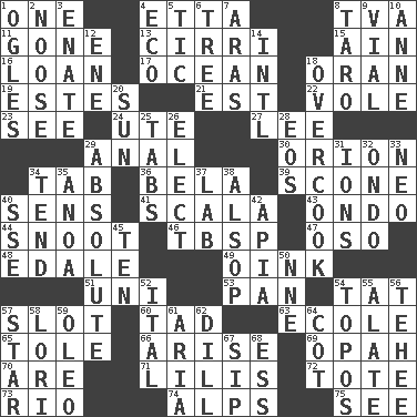 ACROSS 1. Single 4. Singer James 8. Federal power corp. 11. Went 13. High-altitude cloud 15. The 18th letter of the Arabic alphabet 16. Grant temporary use of 17. Sea 18. Northwest Algerian city 19. _____ Park, CO 21. Eastern Standard Time (abbr.) 22. Short-tailed, large-bodied rat 23. Perceive with the eye 24. Shoshoni 27. Area sheltered from the wind 29. Of or related to the anus 30. Constellation of myth 34. Bar bill 36. Actor Lugosi 39. Biscuitlike quick bread 40. Elected reps. 41. Any of the three canals of the cochlea 43. Southwest Nigerian state 44. Snout, nose 46. Cook's measure (abbr.) 47. Bear (Spanish) 48. Peak District village in England 49. Pig sound 51. Corn or form start 53. Baking dish 54. Make lace 57. Groove 60. Small boy 63. Learning spot: Fr. 65. Lacquered or enameled metalware 66. Originate 69. Brightly colored fish 70. "We ___ not amused" (Victoria) 71. Ms. Damita and namesakes 72. Carryall 73. _ de Janeiro 74. High mountains 75. Observe DOWN 1. Stares 2. Trap for birds or small mammals 3. Related on the mother's side 4. Environmental prefix 5. Nervous spasm 6. Woody plant 7. Ancient river in northeast Turkey 8. Edible starchy tuberous root 9. Small bottle 10. Singer Murray 12. Compass dir. 14. International (abbr.) 18. Burn the roast 20. Player for Phoenix 25. Bar bills 26. Choose 28. Greek goddess of the dawn 29. Utter; complete 31. Charged particles 32. Southwest Nigerian state 33. Modern: prefix 34. Watch over 35. Small Philippine buffalo 37. Experiment locale 38. Columnist Joseph or Stewart 40. Compass dir. 42. Capital of Western Samoa 45. Nine, plus one 50. Compass dir. 52. Slanted text style (abbr.) 54. Traditional theme or motif 55. Having winglike extensions 56. Giggle 57. Play the lead 58. Australian parrot (variant) 59. Butter sub 61. Operatic vocal solo 62. Deli pickle 64. Small bed 67. Small drink 68. Double-curved letter