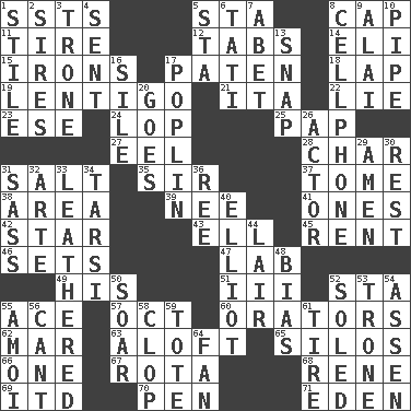 ACROSS 1. Fast planes 5. R.R. building 8. Head covering 11. Become fatigued 12. Bar bills 14. Biblical high priest 15. Removes the wrinkles 17. Eucharist need 18. Pet locale 19. Small, flat, pigmented spot on the skin 21. Call ___ day 22. Untruth 23. Compass dir. 24. Chop off 25. Infant food 27. Snakelike fish 28. Burn to charcoal 31. Table seasoning 35. Title for a knight 37. Heavy book 38. Length times width 39. Born 41. Singles 42. Play the lead 43. Pipe bend 45. Monthly bill 46. Puts into a specified state 47. Experiment locale 49. Part of HMS, perhaps 51. One more than two 52. R.R. building 55. Adept person 57. Sep. follower 60. Speakers 62. Third mo. 63. At or to great height 65. Grain storage towers 66. Single 67. Roll call or roster of names 68. French philosopher Descartes 69. It would 70. Writing instrument 71. Paradise DOWN 1. Vertical member of a panel or frame 2. Begets 3. Heavy duty weighing machine 4. Transmitted 5. R.R. building 6. Jacques of French films 7. Collude with 8. Portable communications device 9. Mountain range southwest of Kyrgyzstan 10. Corncob 13. Fastener 16. Filth; sediment 17. Cotton for raincoats, e.g. 20. Leaves 26. Thespian 29. So be it 30. State of inaction 31. Backtalk 32. Johnson of "Laugh-In" 33. Resembling or made to resemble leather 34. Tarsus (plural) 36. To sift 40. American author Paul (1891-1958) 44. Den 48. Prejudice 50. Fly high 52. Having a sole or soles 53. Marketplace scale 54. NE Netherlands city 55. Mine, in Marseilles 56. Patter 58. Hoof sound 59. Lug 61. Hoop that covers a wheel 64. Air blower