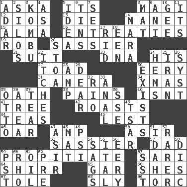ACROSS 1. "____ silly question..." 5. ___ a Wonderful Life 8. Wise men 12. "Vaya con ____" 13. Pass on 14. French painter Edouard 15. _ mater 16. Pleas 19. Director Reiner 20. More impudent 21. Set of matching outer garments 23. Heredity factor (abbr.) 24. Part of HMS, perhaps 27. Frog relative 30. Suggestive of the supernatural 31. Device for capturing images 34. Dec. holiday 35. Pledge 38. Aches 40. Is not 41. Woody plant 42. Ridicules or criticizes harshly 44. Beverages made from leaves 45. For fear that 46. Boat paddle 47. Electrical Unit 50. SW Saudi Arabia district 53. More impudent 57. Male parent 59. Appease 63. Indian skirt 64. Bake eggs in their shells 65. Slender fish 66. "______ My Girl" (Turtles hit) 67. Lacquered or enameled metalware 68. Wily 69. Torque (variant) DOWN 1. The sixth month of the Jewish calendar 2. Grain storage towers 3. Dried seaweed eaten as food 4. White ___ sheet 5. The content of cognition 6. Metal containers 7. Puts into a specified state 8. Floor protector 9. Black tropical American cuckoo 10. Unit of force equal to gravity 11. ___ a Wonderful Life 14. Hindu Mythology: god of death 17. To free from 18. Car or cant ending 20. Portico 22. Strong, restless desires 24. Cloth borders 25. SW Asia republic 26. System (abbr.) 28. Electrical Unit 29. Letter starter 30. Is extant 32. River (Sp.) 33. Of or related to the anus 35. "Beetle Bailey" pooch 36. Type of rug 37. Pull into pieces 39. Compass dir. 43. Russian ruler of old 47. SW Saudi Arabia district 48. Floor protector 49. 23rd letter of the Greek alphabet 51. Potato state 52. More uncommon 54. Droops 55. Slanted text style (abbr.) 56. Suggestive of the supernatural 58. Plate 59. Pacific Standard Time (abbr.) 60. 17th letter of the Greek alphabet 61. Petroleum 62. Before (prefix) 63. Fast jet (abbr.)