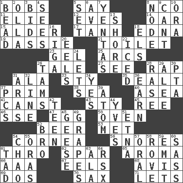 ACROSS 1. Moves up and down 5. Declare 8. Non-commissioned officer (abbr.) 11. Writer Wiesel 12. Nights before holidays 14. Boat paddle 15. Tree or shrub in the Birch family 17. Hyperbolic tangent 18. Pulitzer Prize-winning author Ferber 19. Small ungulate mammals of Africa 21. Rest room 23. Set 25. Arches 26. Lie 27. Perceive with the eye 28. Reproach for some lapse or misdeed 31. Wing 33. Filthy place 35. Started a card game 37. Demure 38. Ocean 40. Toward the sea 41. 2nd pers. sing. pres. of can (arch.) 43. Filthy place 45. Portuguese money of account (variant) 46. Compass dir. 47. Ovum 50. Baking chamber 52. Fermented drink made from hops 53. Was introduced to 54. Pupil covering 56. Sounds asleep 61. Through, poetically 62. Coast Guard woman 65. Odor 66. American Automobile Association (abbr.) 67. Snakelike fish 68. Deliberation 69. Two (Sp.) 70. Saxophone 71. Allows DOWN 1. Necklace unit 2. Water jar 3. Auction offers 4. Observes 5. Arrange properly for use 6. Actress Gardner 7. Gossips 8. Thickened enlargement 9. Patter 10. Mouth or opening 13. Dinah or Pauly 16. Port city in Latvia 18. Raised railways 20. Snakelike fish 22. On the rocks 24. Allows 26. Scottish caps 28. To erase 29. Toward shelter 30. Parent Teacher Association (abbr.) 31. Ancient river in northeast Turkey 32. Actor's bit 34. Consenting reply 36. Merit 37. Personal Computers (abbr.) 39. Smallest unit of an element 42. Adolescent 44. Jacques Cousteau's middle name 48. Honkers 49. Wine fruits 51. Inactive volcano in Sicily 52. Sis' sibling 54. US Secretary of Labor Elaine L. _ 55. Mouths or openings 57. Of the mouth 58. Be footloose 59. Give off 60. Backtalk 61. Small boy 63. According to 64. Acura sports coupe