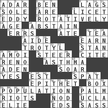ACROSS 1. The sixth month of the Jewish calendar 5. Benjamin's nick name 8. Fails to keep up a pace 12. Not divided or shared with others 13. "We ___ not amused" (Victoria) 14. It is permitted: Lat. 15. Whirlpool 16. Producing rotation 19. Ripen 20. Refrain by choice 21. Blunders 23. Had dinner 24. Beverage made from leaves 27. Helper 30. Merit 31. Trinitrotoluene 34. Comedian Laurel of Laurel & Hardy 35. Mine, in Marseilles 38. Navigate 40. Quote 41. Western Nevada city 42. Respiratory problem 44. An important port of Yemen 45. Fly high 46. Consenting reply 47. Eastern Standard Time (abbr.) 50. Petty quarrel 53. Curse 57. Gift holder 59. Census information 63. Inside of hand 64. Debaucheries 65. Lower and raise head in agreement 66. Southern CA. univ. 67. Writer Wiesel 68. Begley and Asner 69. Backtalk DOWN 1. At sea 2. Evade 3. Tree or shrub in the Birch family 4. Marina Del _, California 5. Sharp remark 6. Greek god of love 7. Remaining after all deductions 8. 54 in ancient Rome 9. Adept person 10. Set 11. Filthy place 14. Actor's bit 17. Auto club (abbr.) 18. Teat (slang) 20. SW Saudi Arabia district 22. Food allowance for one day 24. Jacques of French films 25. Part of Q.E.F. 26. Queen of England 1702-14 28. Two (Sp.) 29. Singer James 30. Fortification 32. Consenting reply 33. Allows 35. Like ___ of sunshine 36. Ancient Persian 37. Washington bills 39. 17th letter of the Greek alphabet 43. Vertical spar for supporting sails 47. Snakelike fish 48. Health resort 49. Teat (slang) 51. Phillipine bananalike plant 52. For Whom the Bell _____ 54. Prong on a fork 55. Parka part 56. Conclusions 58. Dec. holiday 59. Before (prefix) 60. Lubricate 61. Luau course 62. Shoshoni 63. Purulenc