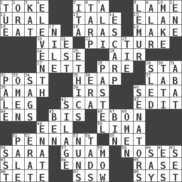 ACROSS 1. Puff or smoke 5. Call ___ day 8. Unable to walk 12. Mountain range 13. Falsehood 15. Liveliness 16. Ingested 18. Ancient river in northeast Turkey 19. Cause to be 20. Compete 22. Photo 24. Otherwise 26. Wind 27. Remaining after all deductions 28. Before (prefix) 29. R.R. building 32. Mail 35. Pile 37. Experiment locale 38. Wet nurse 39. Big collection agency 40. Bristle 41. Part of a journey 42. Scram! 43. Prepare for publication 44. Followers of ems 45. Twice 46. Inky black, to poets 49. Snakelike fish 50. Pale green bean 51. Pre-World Series prize 55. Fish or hair follower 56. "Two Mules for Sister ____" 57. Island territory of the United States 59. Olfactory organs 63. Narrow board 64. Inside; within (prefix) 65. Raze (variant) 66. False hair 67. Compass dir. 68. System (abbr.) DOWN 1. Third day of the wk. 2. Mouth or opening 3. Krazy ___ of comics 4. Veterans Day date 5. Call ___ day 6. Canvas cover 7. Jai _ 8. Arboreal primate 9. Having or resembling wings 10. Create 11. Compass dir. 14. Fortification 17. Mediterranean tributary 21. Eastern Standard Time (abbr.) 23. Neckwear 25. Value system 28. Soft color 29. Downhill vehicle 30. Jacques of French films 31. Blind as ____ 32. Light colored 33. Sign of things to come 34. Settles 36. Epoch 40. Legislators 42. Fodder prepared in a silo 45. Benjamin's nick name 47. Storage container 48. Presage 49. Maternal 51. Light colored 52. Part of Q.E.F. 53. Religious women 54. Small amounts or degrees 56. Fast jet (abbr.) 58. Cut the grass 60. Declare 61. Curvy letter 62. Arrange properly for use