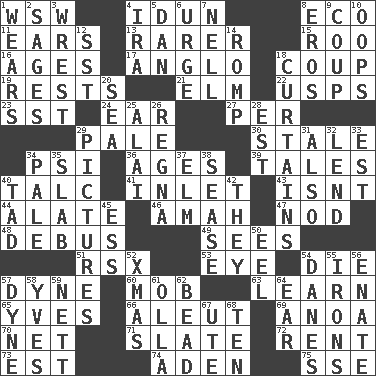 ACROSS 1. Compass dir. 4. Goddess of spring and wife of Bragi 8. Environmental prefix 11. Hearing organs 13. More valued for its uncommonness 15. Friend of Pooh 16. Grows older 17. White American of non-Hispanic descent 18. Clever action or accomplishment 19. Musical pauses 21. Shade tree 22. United States Postal Service (abbr.) 23. Fast jet (abbr.) 24. Ewer handle 27. For each 29. Light colored 30. Having lost freshness 34. Air pressure measure (abbr.) 36. Eons 39. Falsehoods 40. Baby powder 41. An arm off of a larger body of water 43. Is not 44. Having winglike extensions 46. Wet nurse 47. Allow head to fall sleepily 48. To get out of a bus 49. Observes 51. Acura sports coupe 53. Sight organ 54. Expire 57. Centimeter-gram-second unit of force 60. Disorderly crowd 63. Memorize 65. Jacques Cousteau's middle name 66. Native American of Southwest Alaska 69. Small Philippine buffalo 70. Fish or hair follower 71. Schedule 72. Monthly bill 73. Eastern Standard Time (abbr.) 74. Arabian gulf 75. Compass dir. DOWN 1. Puts on (as clothing) 2. Gurus 3. Obtain by seizing forcibly or violently 4. Lyricist Gershwin 5. Daniel's nick name 6. Goad 7. 1994 drama film starring Jodie Foster 8. Greek god of love 9. Clever action or accomplishment 10. I made a mistake 12. Fast jet (abbr.) 14. Play 18. Window treatments 20. Ocean 25. Jai _ 26. Canadian anthropologist Darnell 28. Eastern Standard Time (abbr.) 29. Photos 31. In addition 32. Grant temporary use of 33. Eastern Standard Time (abbr.) 34. Diluted with white 35. Thick slice 37. Shade tree 38. Gospel singer Marvin 40. Bit 42. Those things 45. Curvy letter 50. Snakelike fish 52. Dec. holiday 54. Natives or inhabitants of Denmark 55. Removes the wrinkles 56. Maternal 57. Centimeter-gram-second unit of force 58. Jacques Cousteau's middle name 59. Remaining after all deductions 61. Rounded earthenware pot or jar 62. Necklace unit 64. Hearing organ 67. Shoshoni 68. "___ Little Indians"