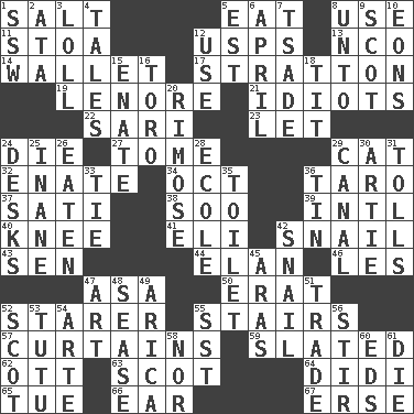 ACROSS 1. Table seasoning 5. Consume 8. Purpose 11. Portico 12. United States Postal Service (abbr.) 13. Non-commissioned officer (abbr.) 14. Place for singles 17. Ski resort town in Vermont 19. Poe poem 21. Foolish or stupid persons 22. Indian skirt 23. Allow 24. Pass on 27. Heavy book 29. Domesticated feline 32. Related on the mother's side 34. Sep. follower 36. Pacific island yam 37. Suttee (variant) 38. "Barney Miller" actor Jack 39. International (abbr.) 40. Leg joint 41. Connecticut Ivy Leaguer 42. Slow-paced one 43. Elected rep. 44. Flair 46. French article 47. White ___ sheet 50. Part of Q.E.F. 52. A viewer who gazes fixedly 55. Flight of steps 57. Window treatments 59. Scheduled 62. Baseball player Mel 63. Highlander 64. "You Light Up My Life" star Conn 65. Third day of the wk. 66. Hearing organ 67. Celtic language DOWN 1. Compass dir. 2. "One Day ___ Time" 3. Hang loosely or laxly 4. Stories 5. Eastern Standard Time (abbr.) 6. Showery time 7. Sadhe (variant) 8. To (old English) 9. Native of Scotland 10. Immeasurably long periods of time 12. Purpose 15. Maternal 16. "Corrida" creature 18. Teat (slang) 20. Full of chinks, cracks, or crevices 24. Writing tables 25. Silly 26. Eroded 28. Learning spot: Fr. 29. Lessep's creation 30. Nick name for Arthur 31. For Whom the Bell _____ 33. Standoff 35. Rest room 36. Shallow baking pan 42. Slow-paced one 45. Ancient river in northeast Turkey 47. Tate display 48. Gospel singer Marvin 49. N. Chile seaport 51. Exchange 52. Native of Scotland 53. Ballerina skirt 54. Johnson of "Laugh-In" 55. Fast jet (abbr.) 56. Commotion 58. Or not 60. Begley and Asner 61. Expire